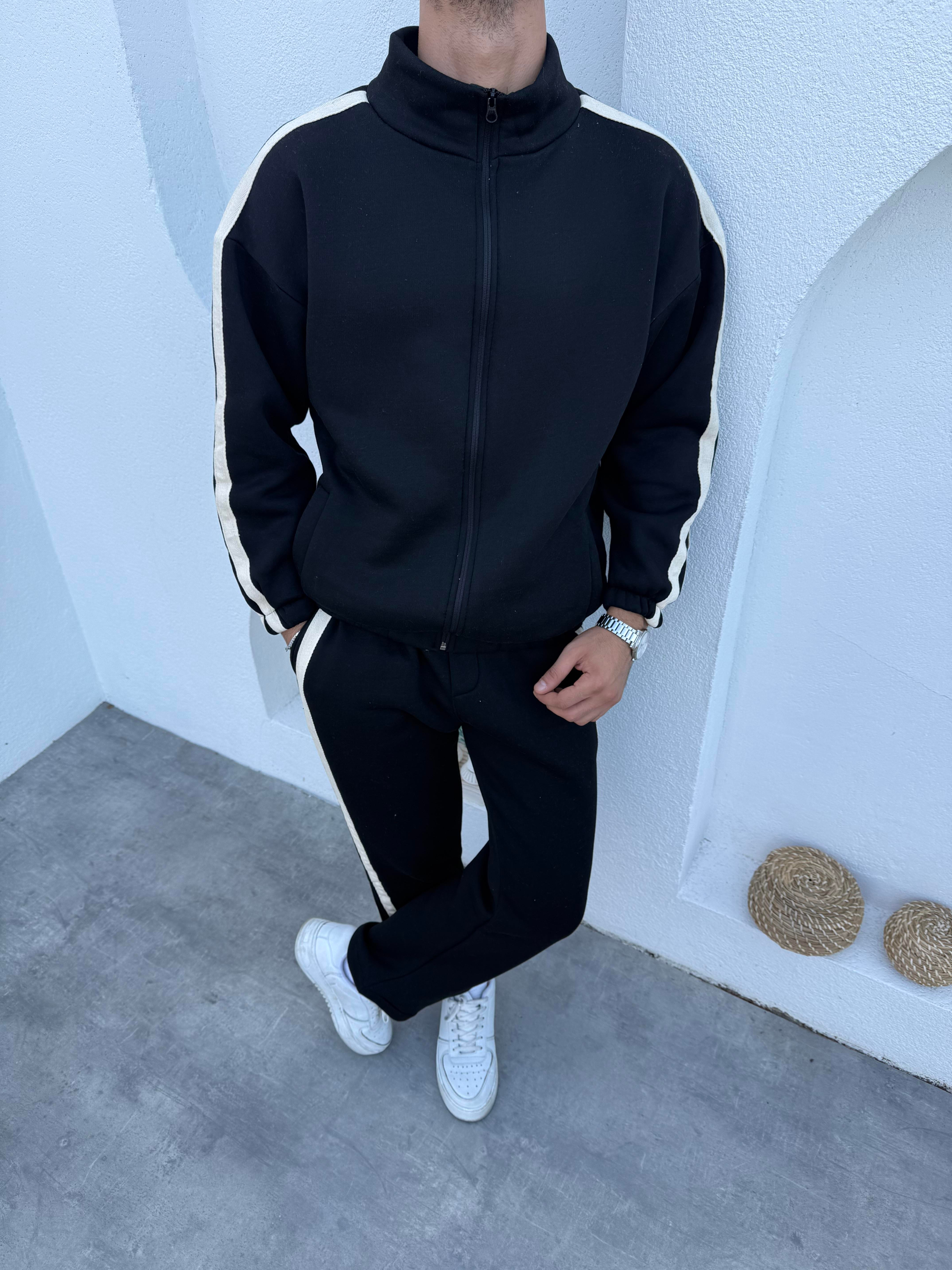 3 İplik Şardonlu Şerit Detaylı Takım Siyah