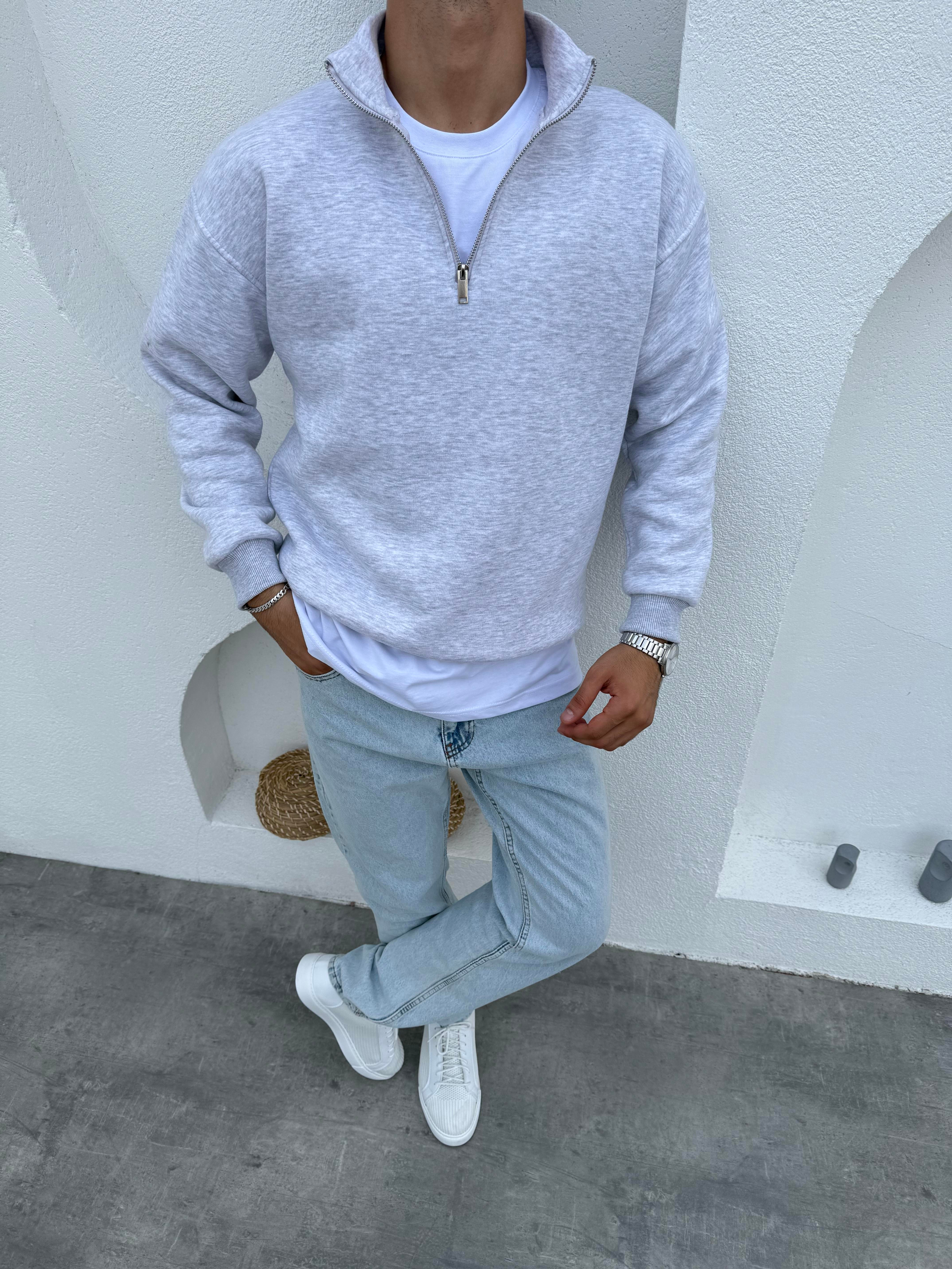 3 İplik Şardonlu Yarım Fermuar Sweatshirt Gri (FM91649)