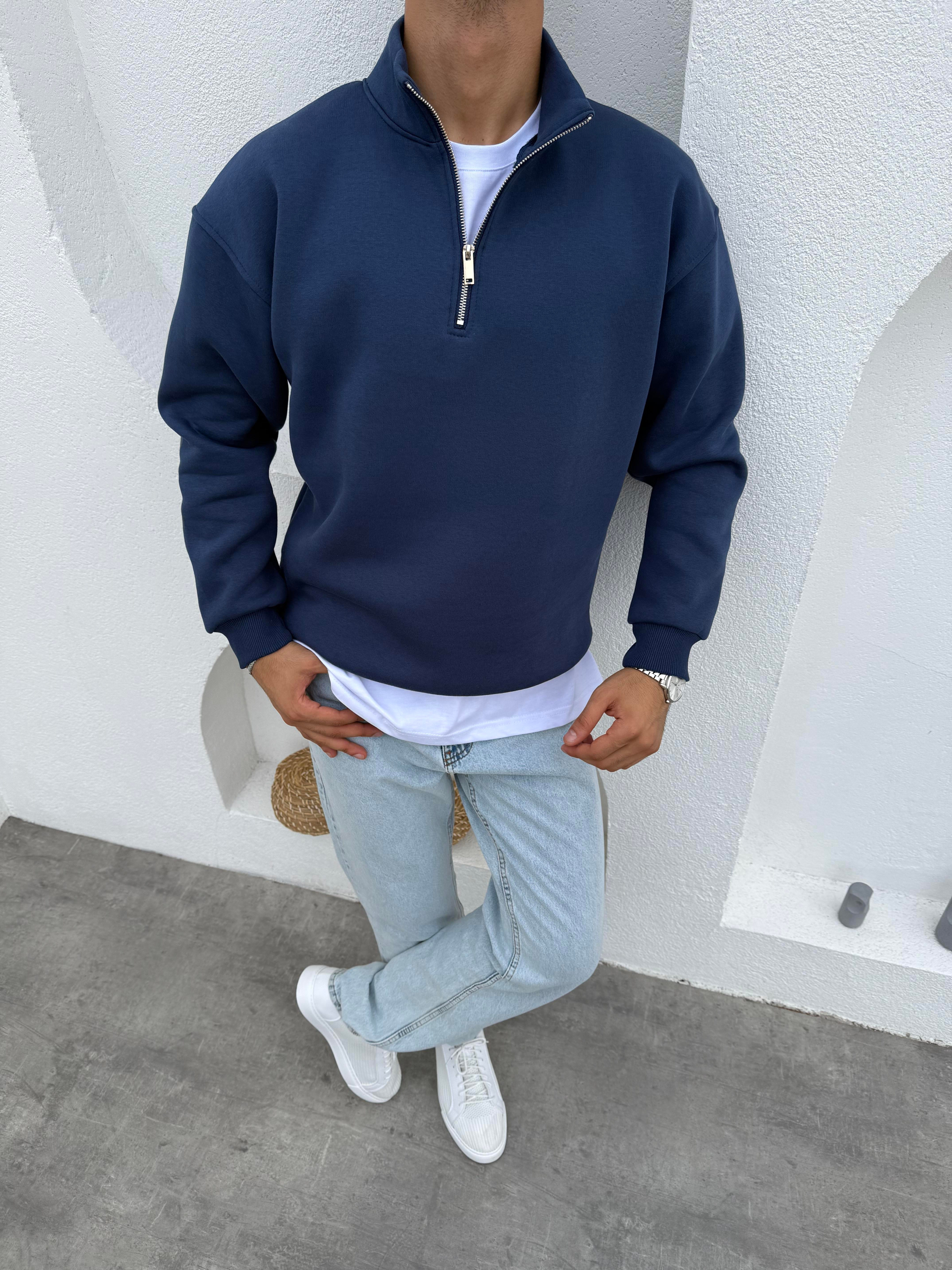 3 İplik Şardonlu Yarım Fermuar Sweatshirt Lacivert (FM91649)