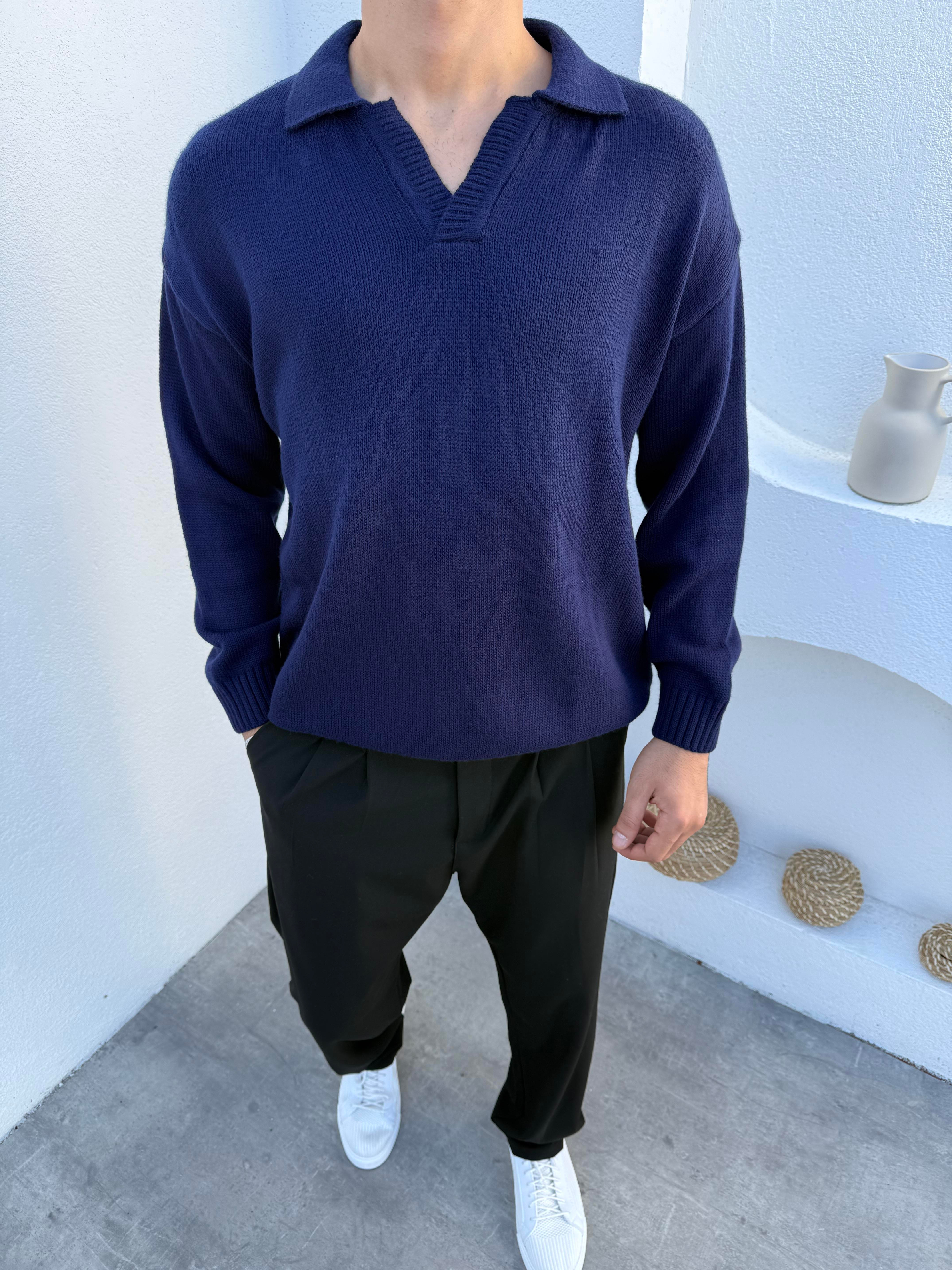 Yünlü Apaş Yaka Triko Kazak Lacivert (FM19264)