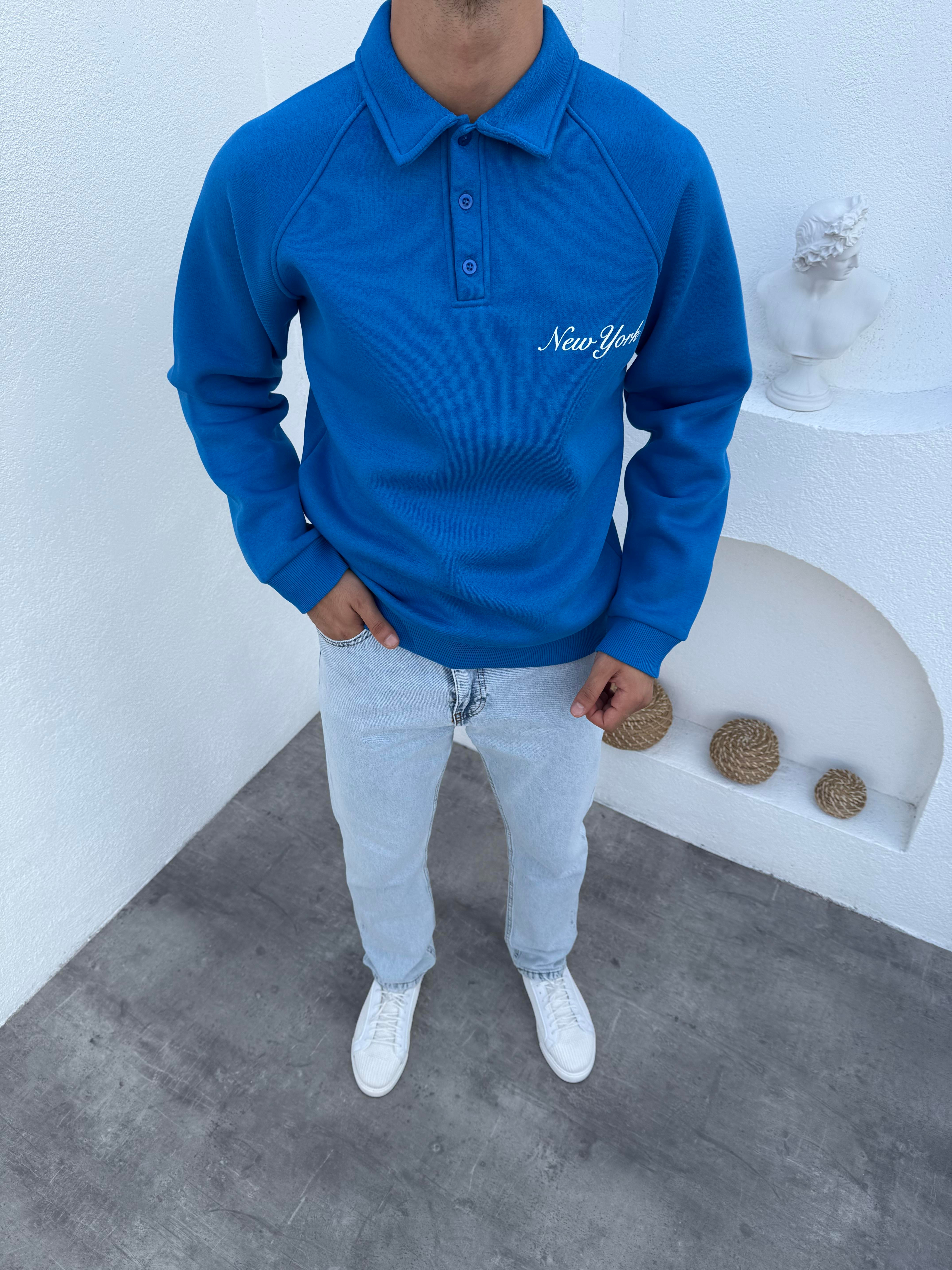 3 İplik Şardonlu Düğmeli Polo Yaka New York Sweatshirt Mavi (FM28163)
