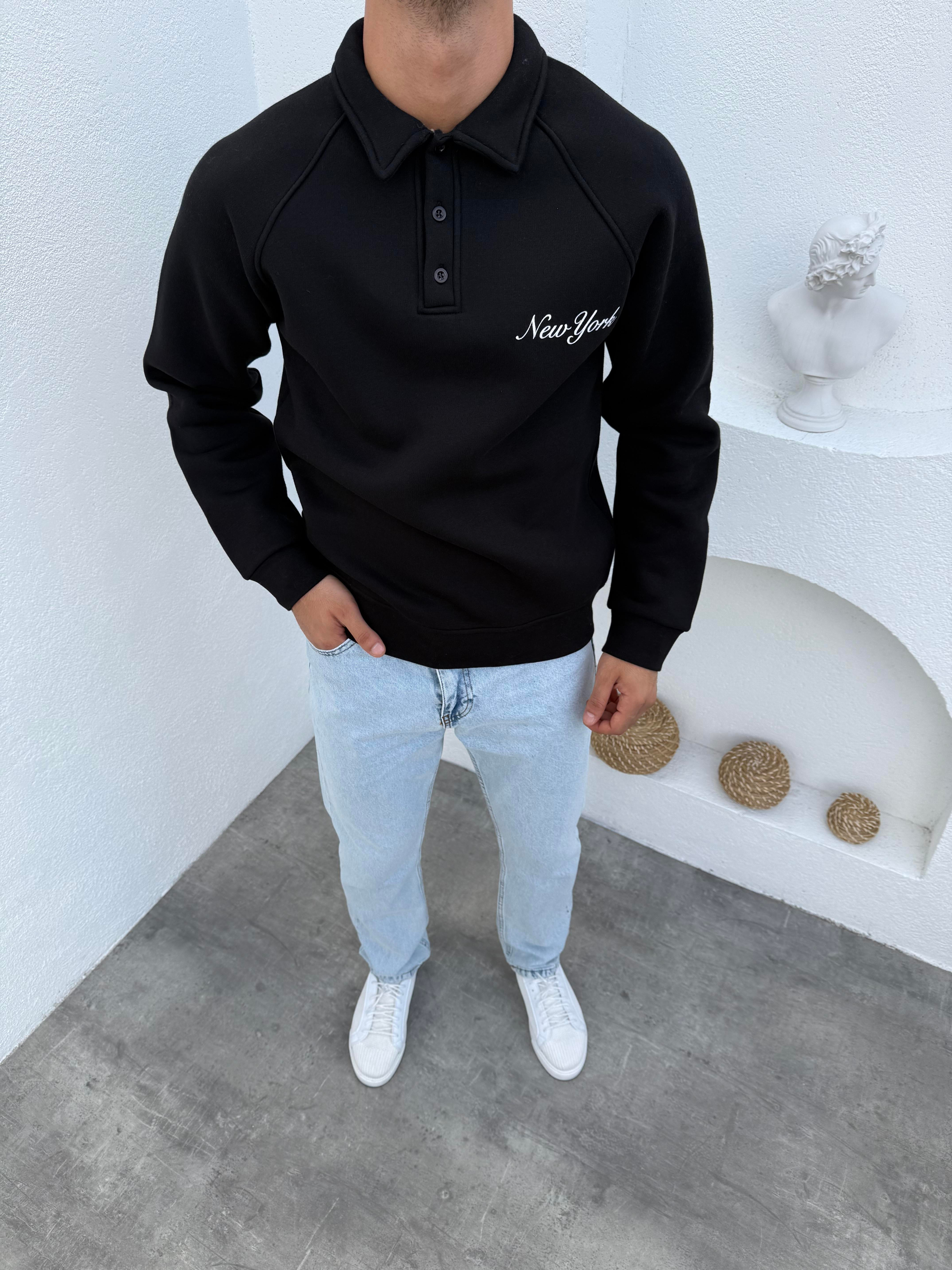 3 İplik Şardonlu Düğmeli Polo Yaka New York Sweatshirt Siyah
