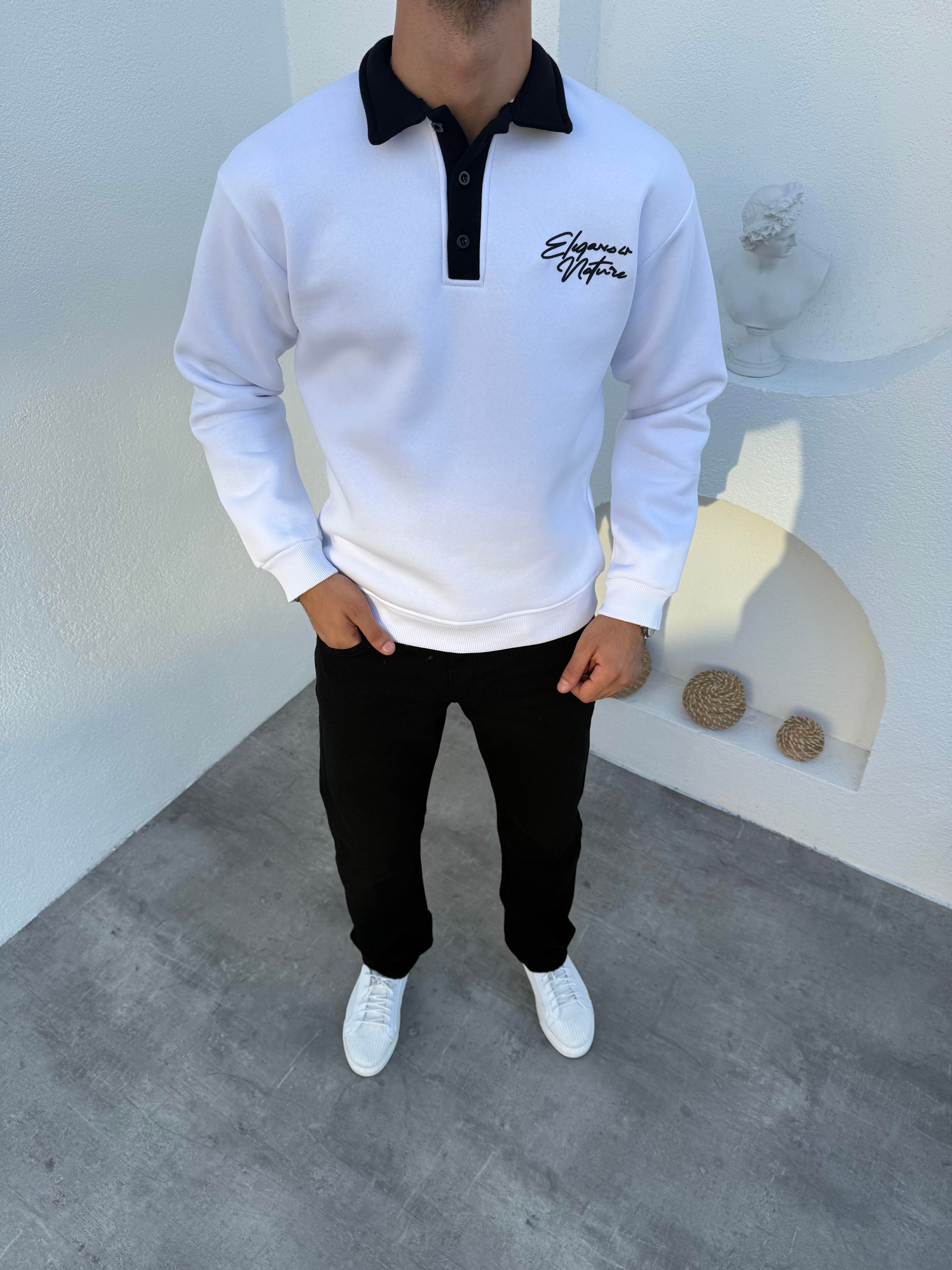 3 İplik Şardonlu Polo Yaka Düğmeli Elegance Sweatshirt Beyaz