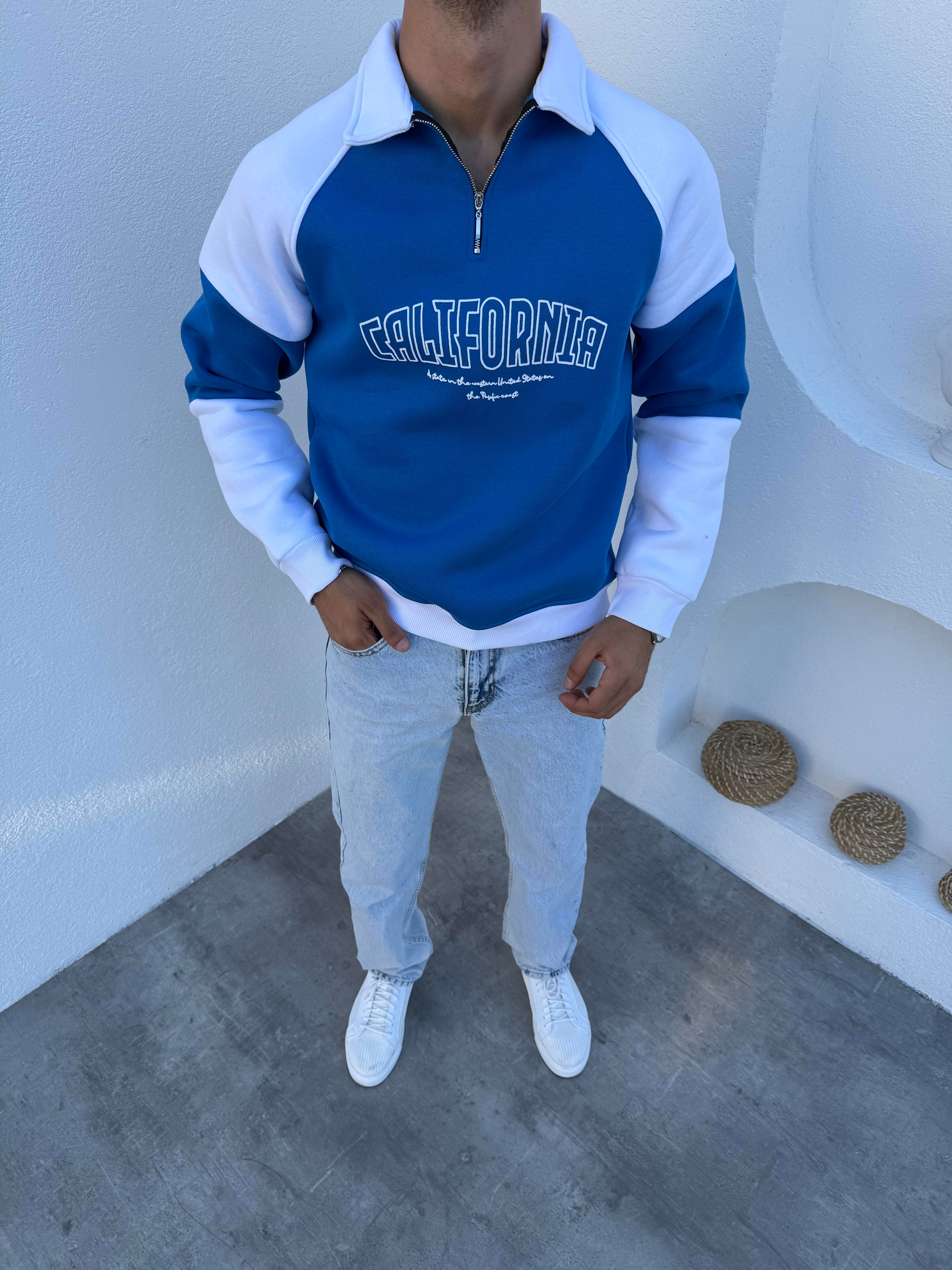 3 İplik Şardonlu Yarım Fermuar California Sweatshirt Mavi