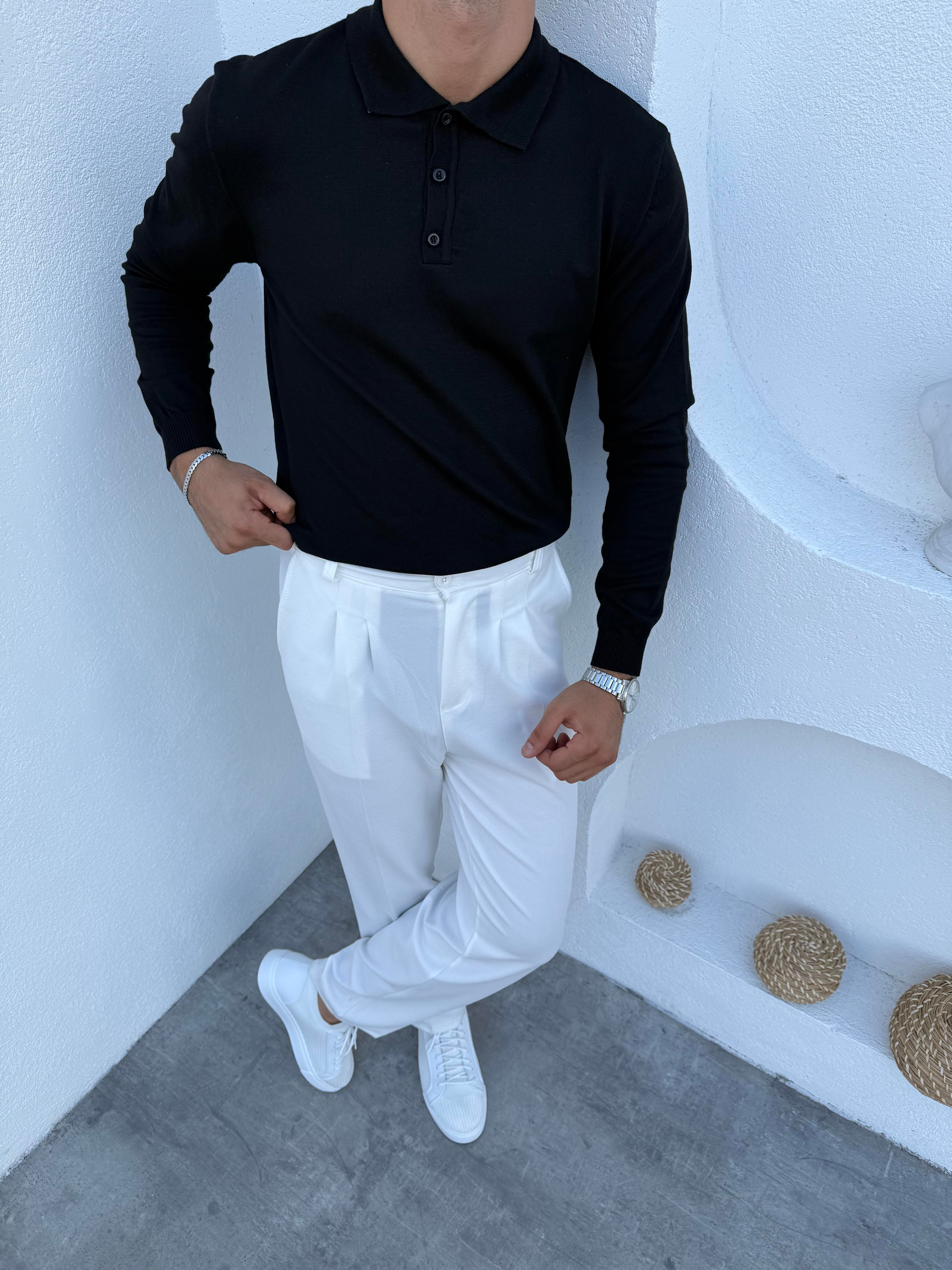 Basic Düğmeli Polo Yaka Triko Kazak Siyah