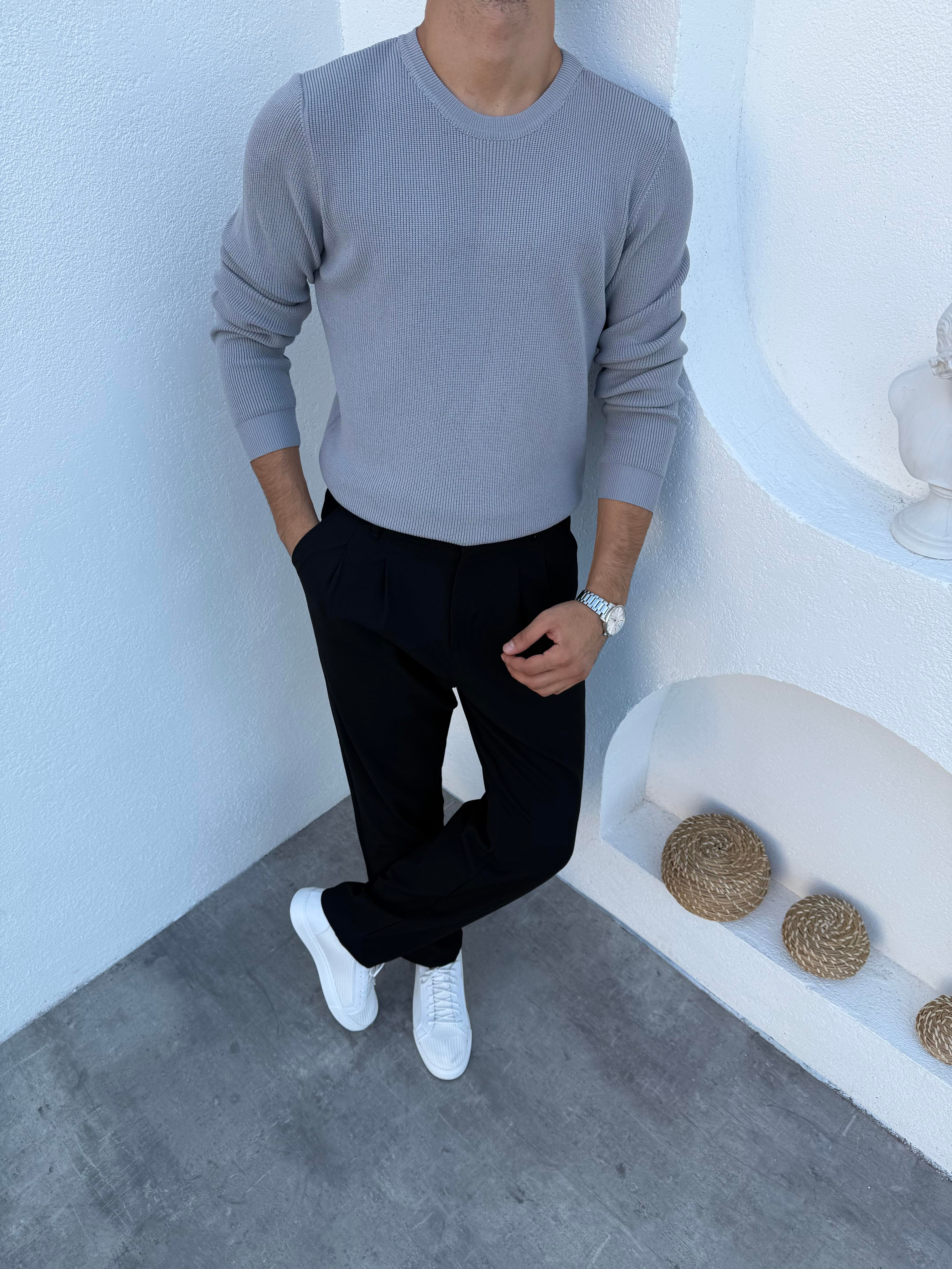 Çelik Örme Bisiklet Yaka Triko Kazak Gri