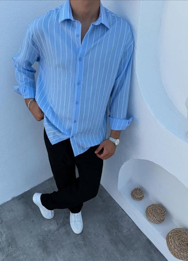Çift Çizgili Pamuklu Keten Gömlek Bebe Mavi (FM69263)