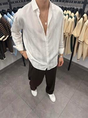 Çift Çizgili Pamuklu Keten Gömlek Beyaz