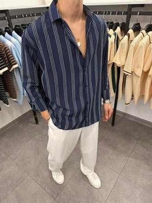 Çift Çizgili Pamuklu Keten Gömlek Lacivert (FM69263)