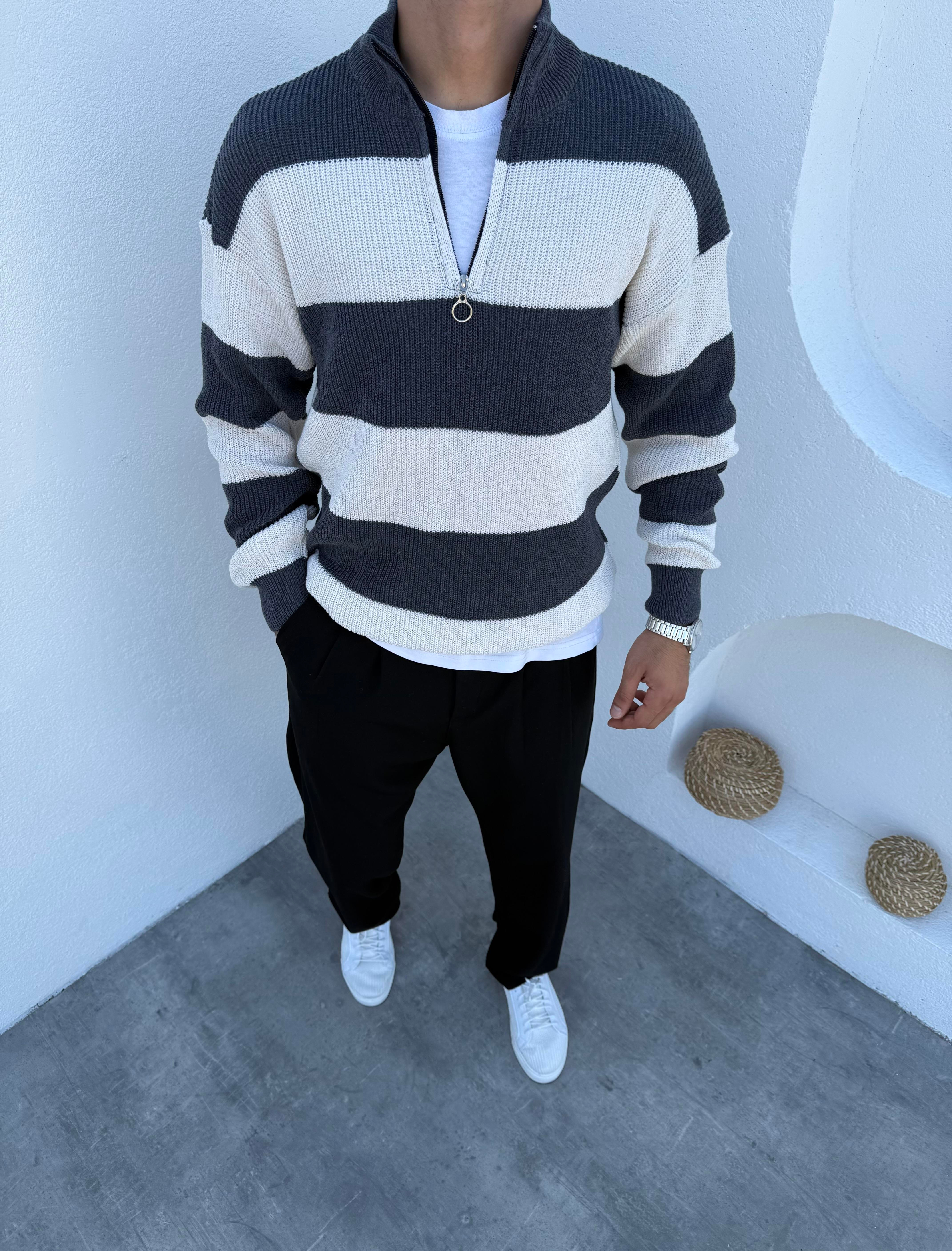 Çift Renk Detaylı Çizgili Yarım Fermuar Triko Antrasit