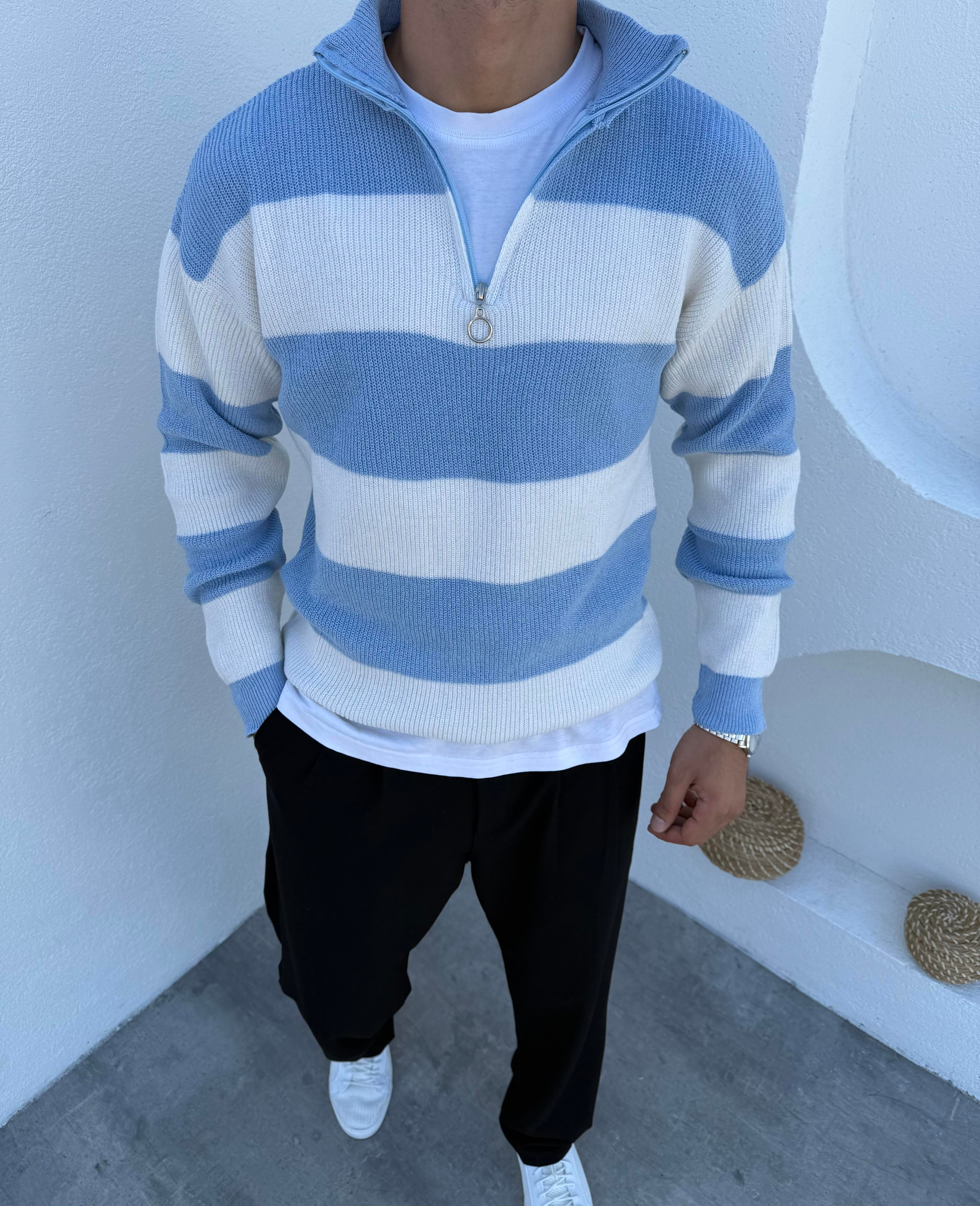 Çift Renk Detaylı Çizgili Yarım Fermuar Triko Bebe Mavi (FM03022)