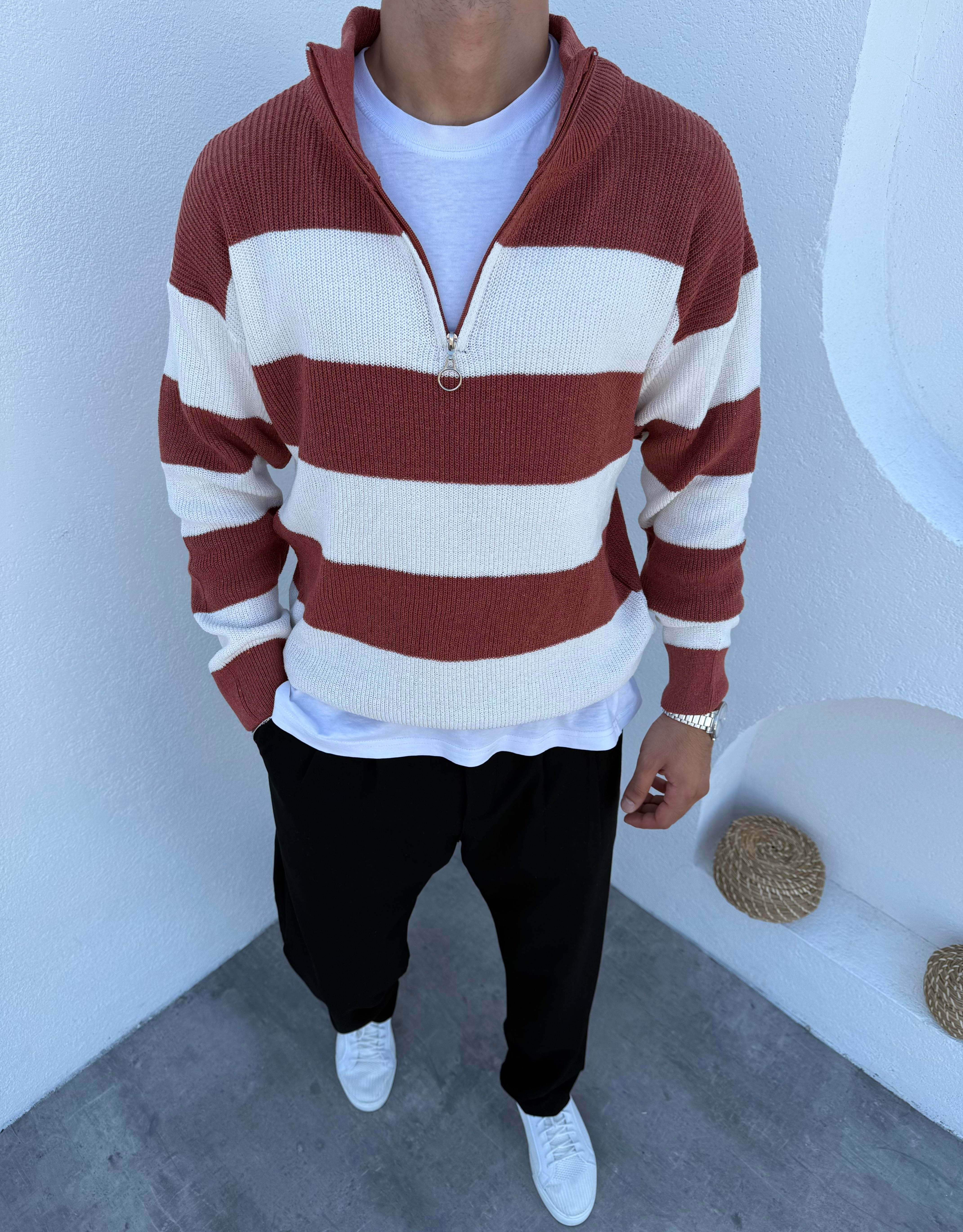 Çift Renk Detaylı Çizgili Yarım Fermuar Triko Kiremit