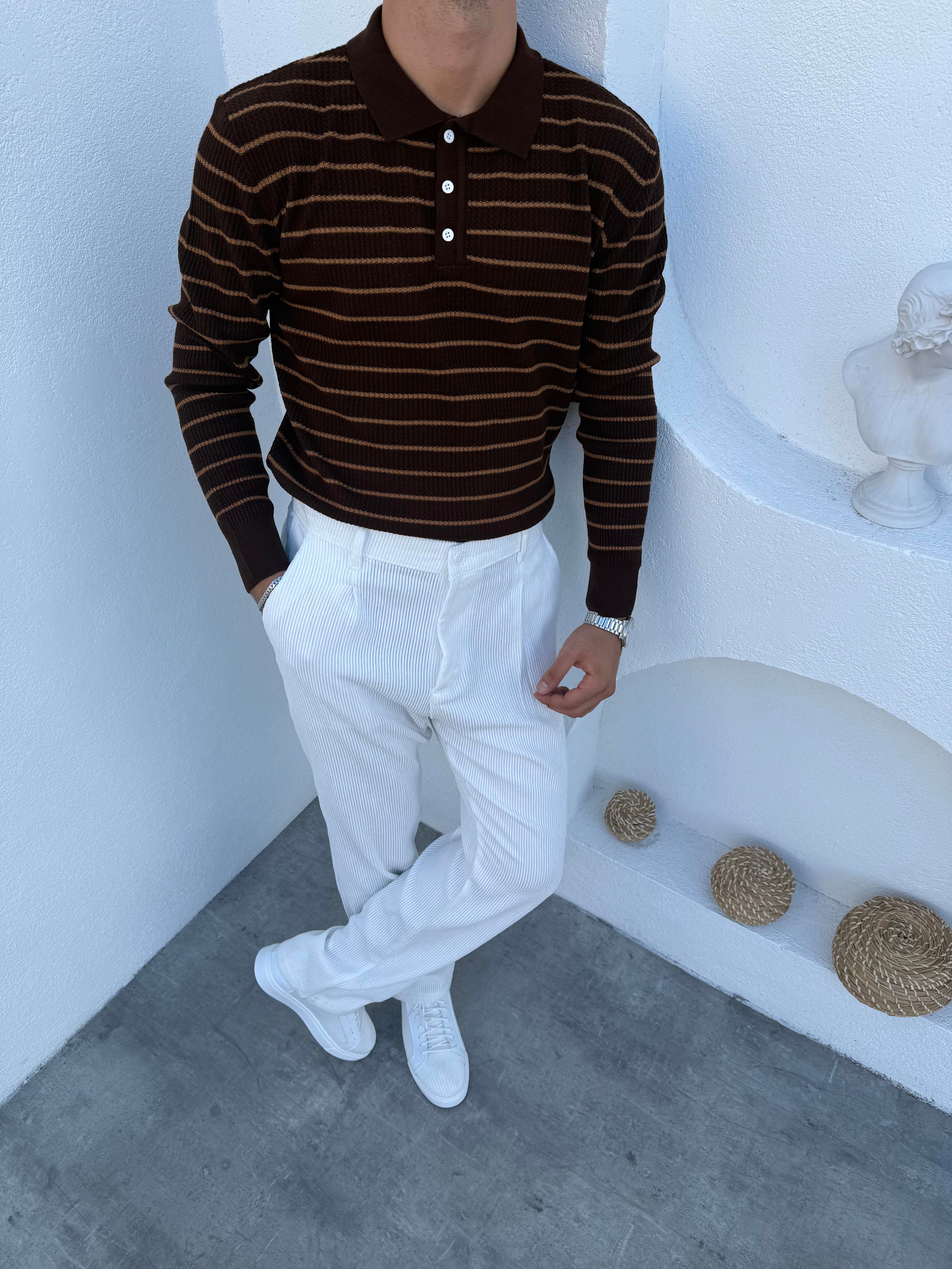 Çizgili Polo Yaka Triko Kazak Kahve (FM87312)