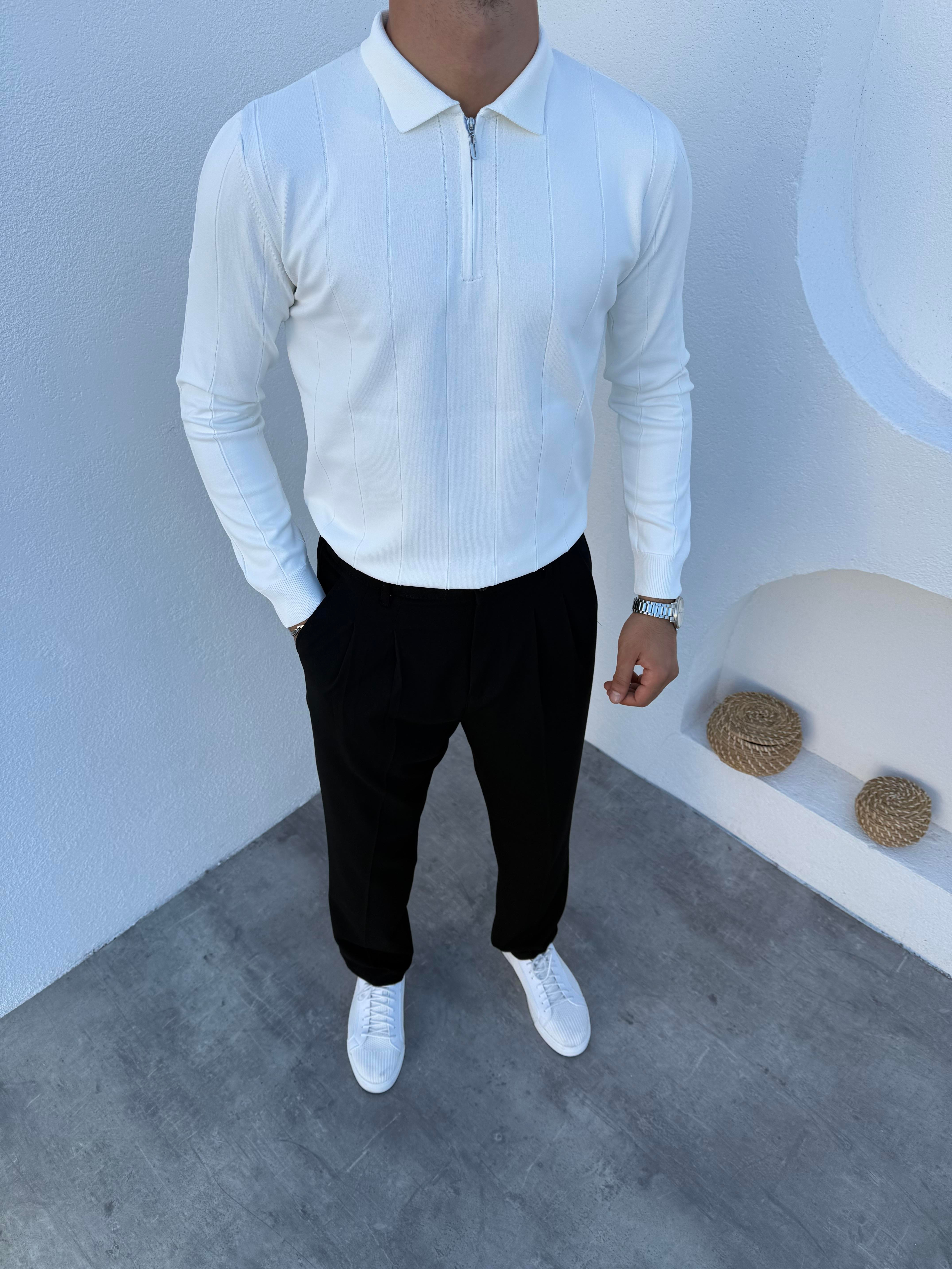 Çizgili Yarım Fermuar Çelik Örme Triko Kazak Beyaz