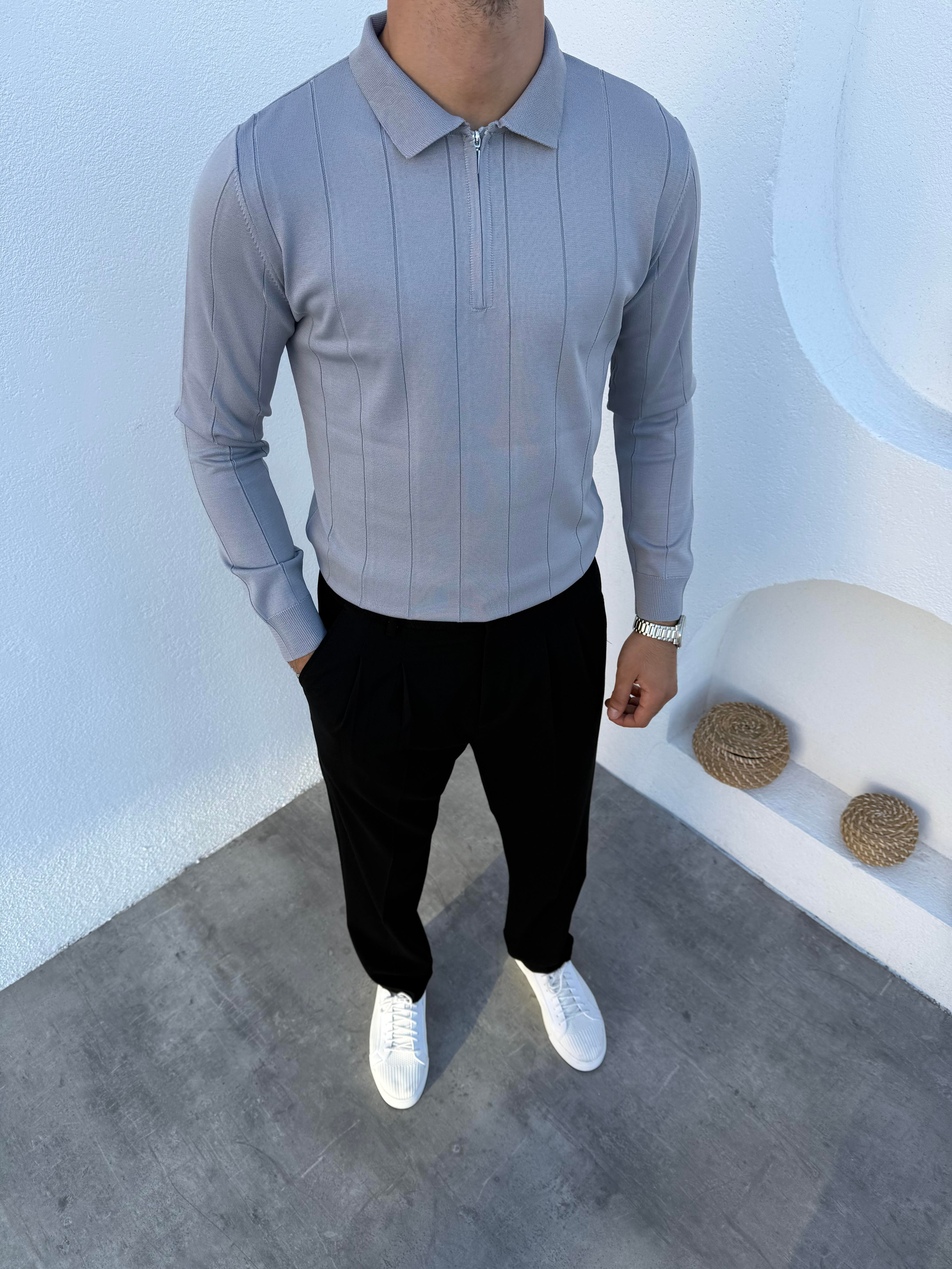 Çizgili Yarım Fermuar Çelik Örme Triko Kazak Gri