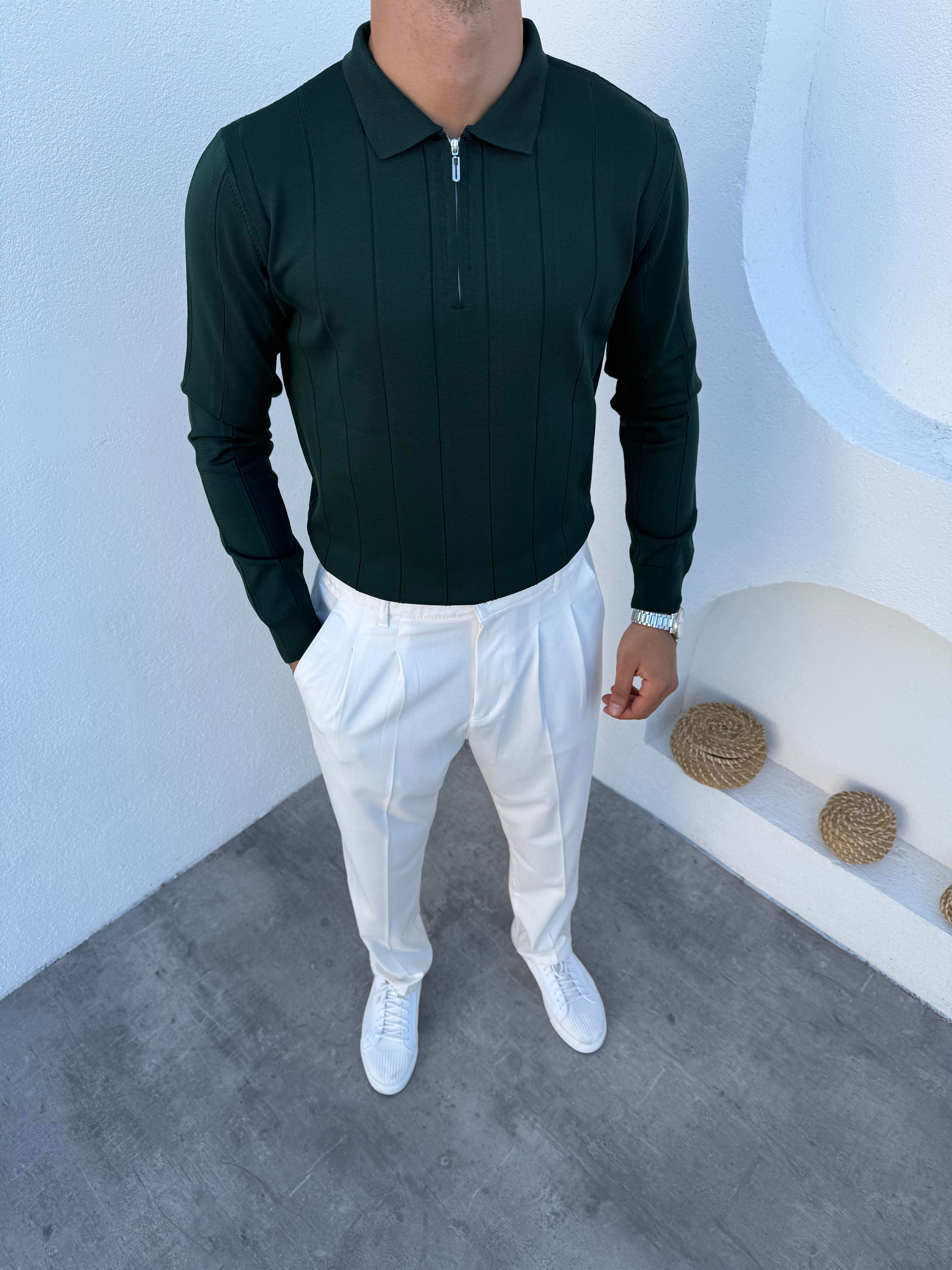 Çizgili Yarım Fermuar Çelik Örme Triko Kazak Yeşil
