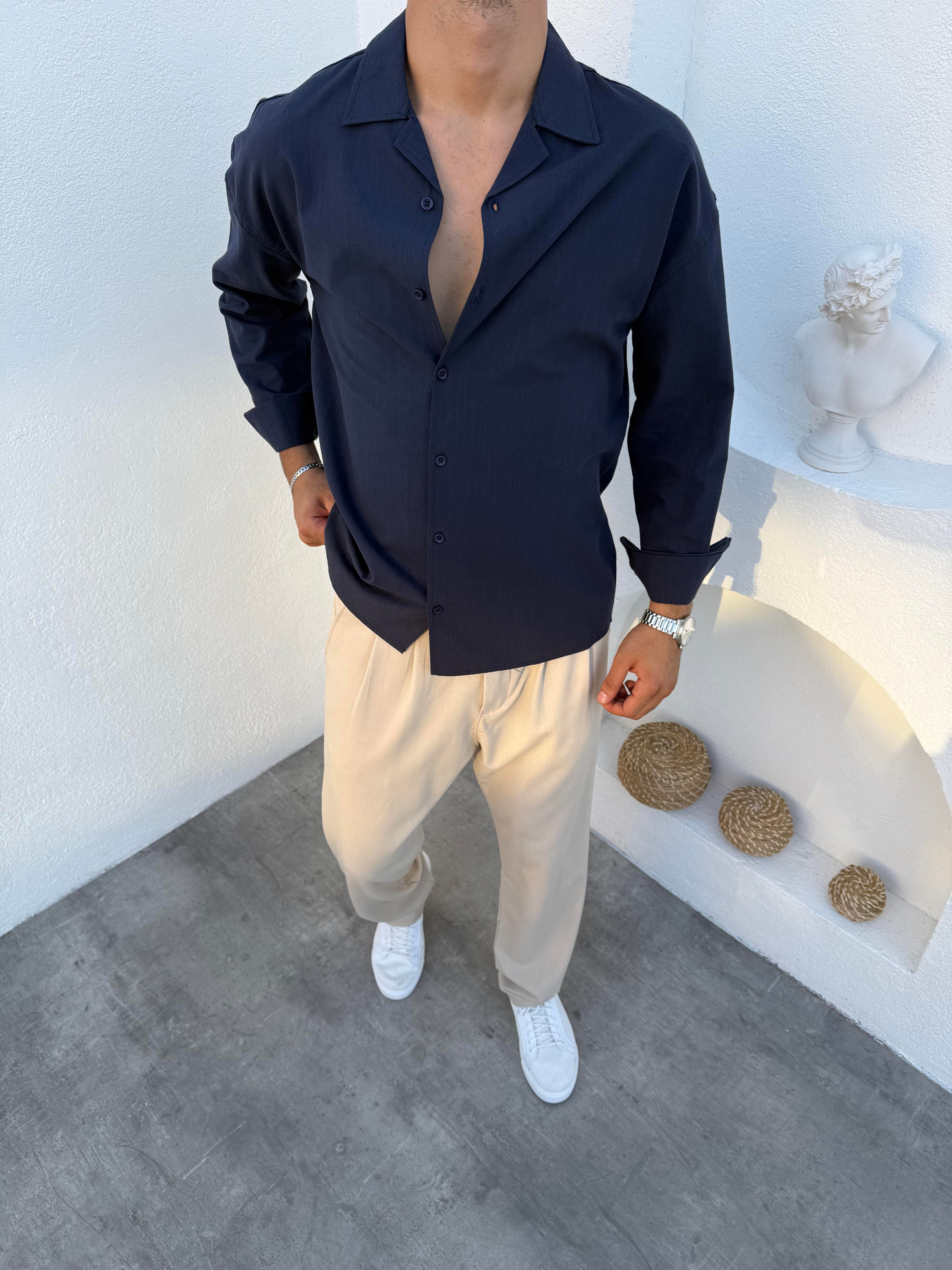 Flamlı Keten Kalın Gömlek Lacivert (FM62945)