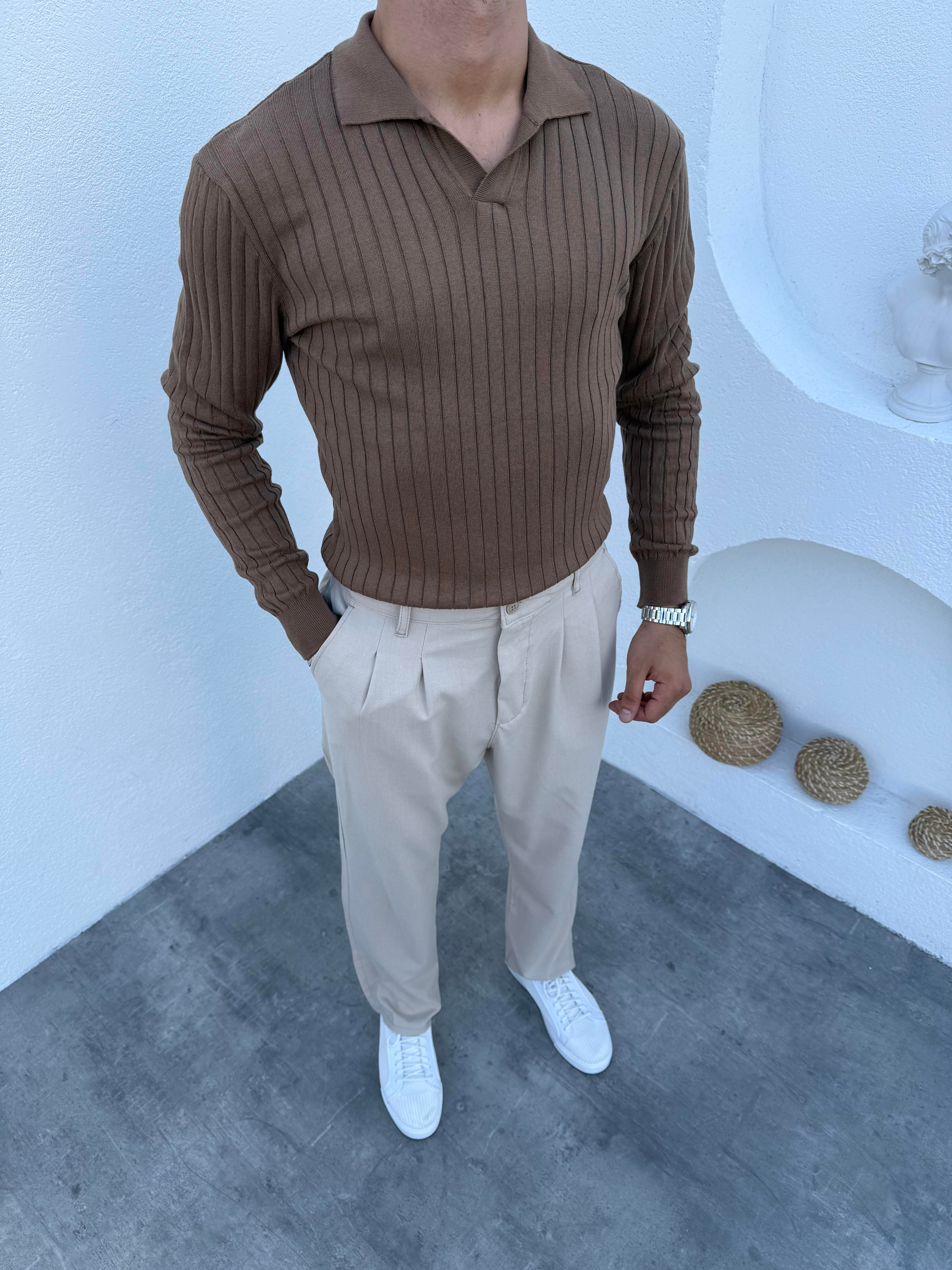 İnce Fitilli Apaç Yaka Triko Kahve