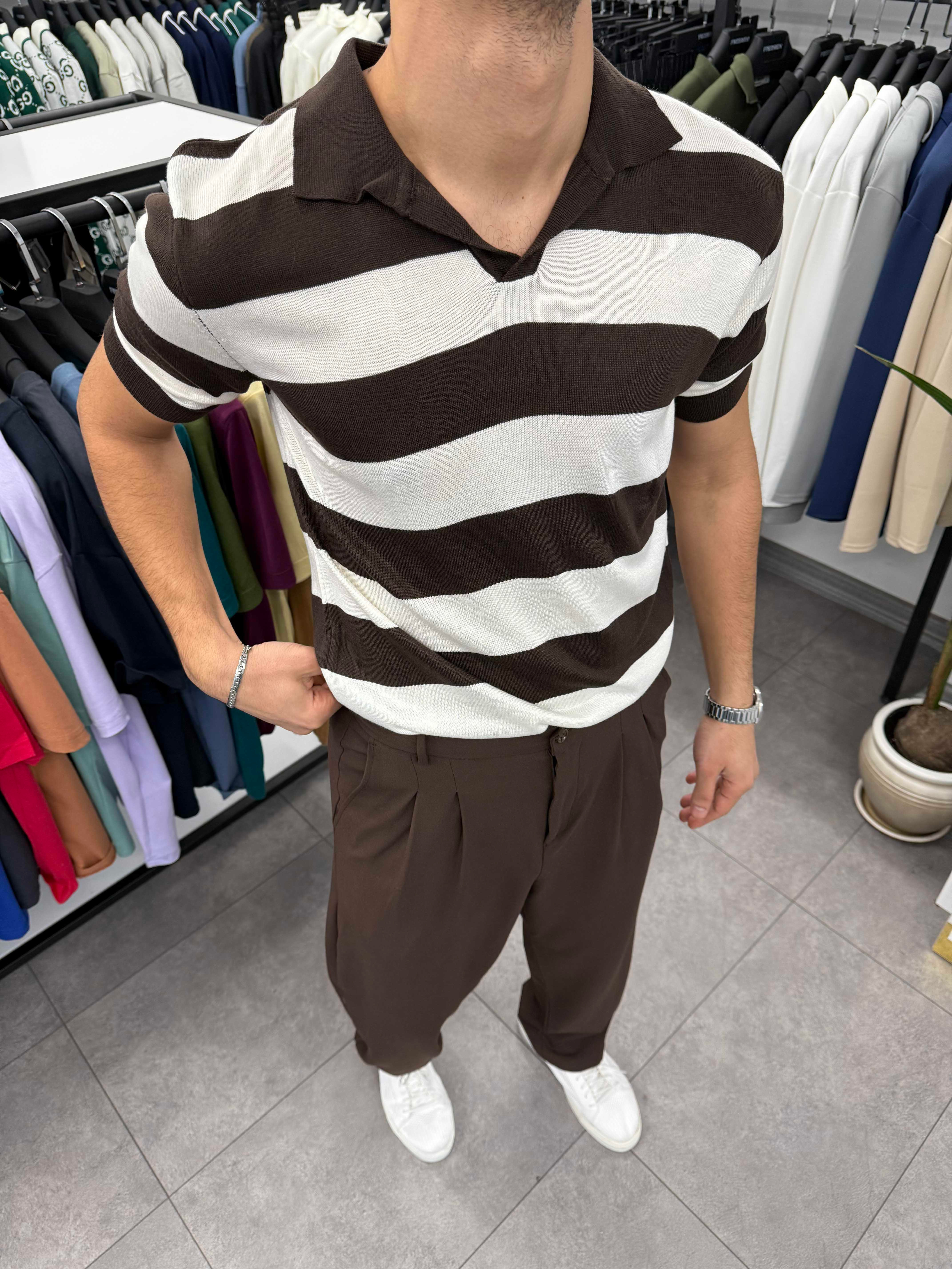 Kalın Çizgi Detaylı Polo Yaka Triko Acı Kahve