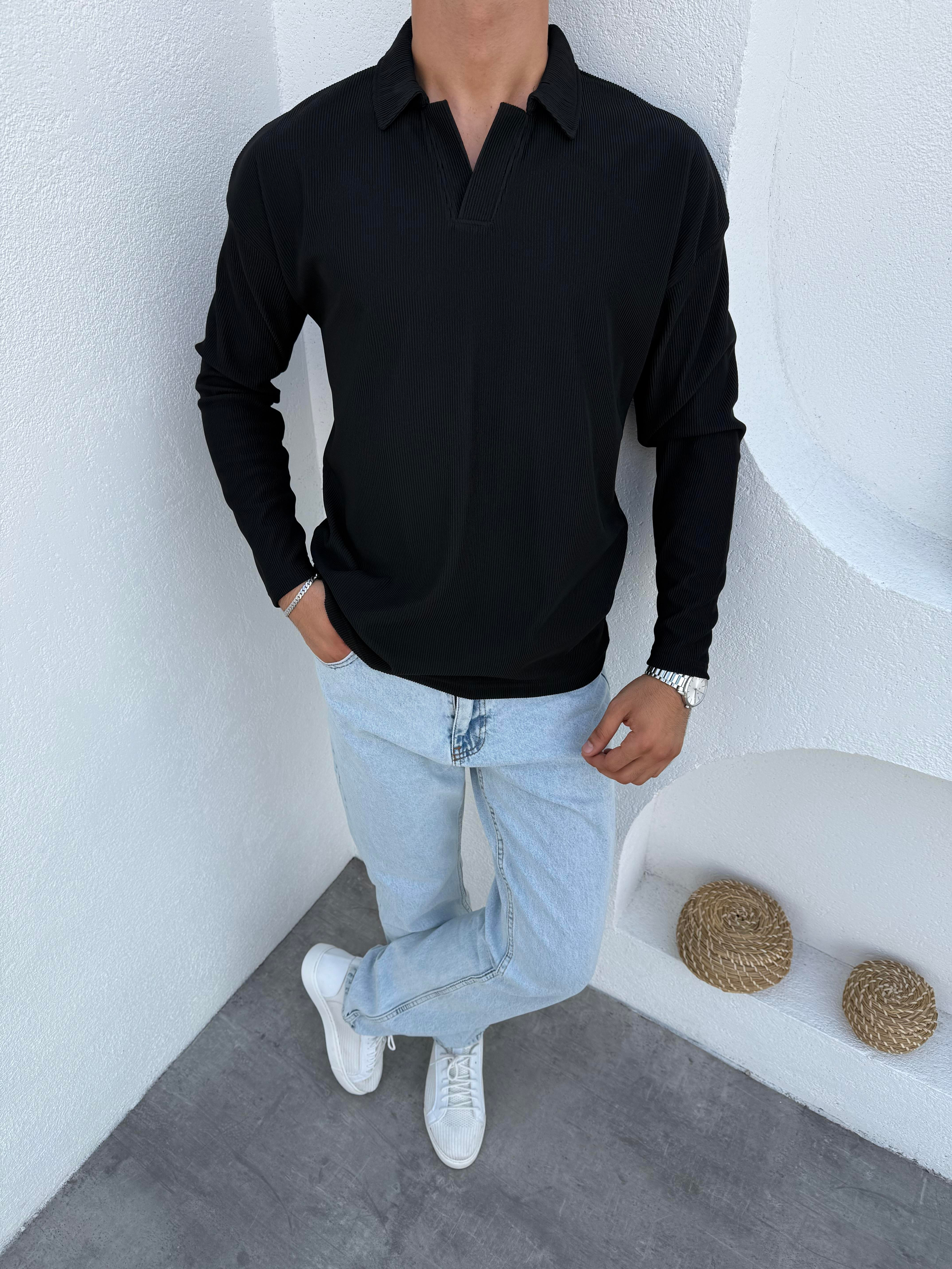 Likralı Ottoman Apaş Yaka Sweatshirt Siyah