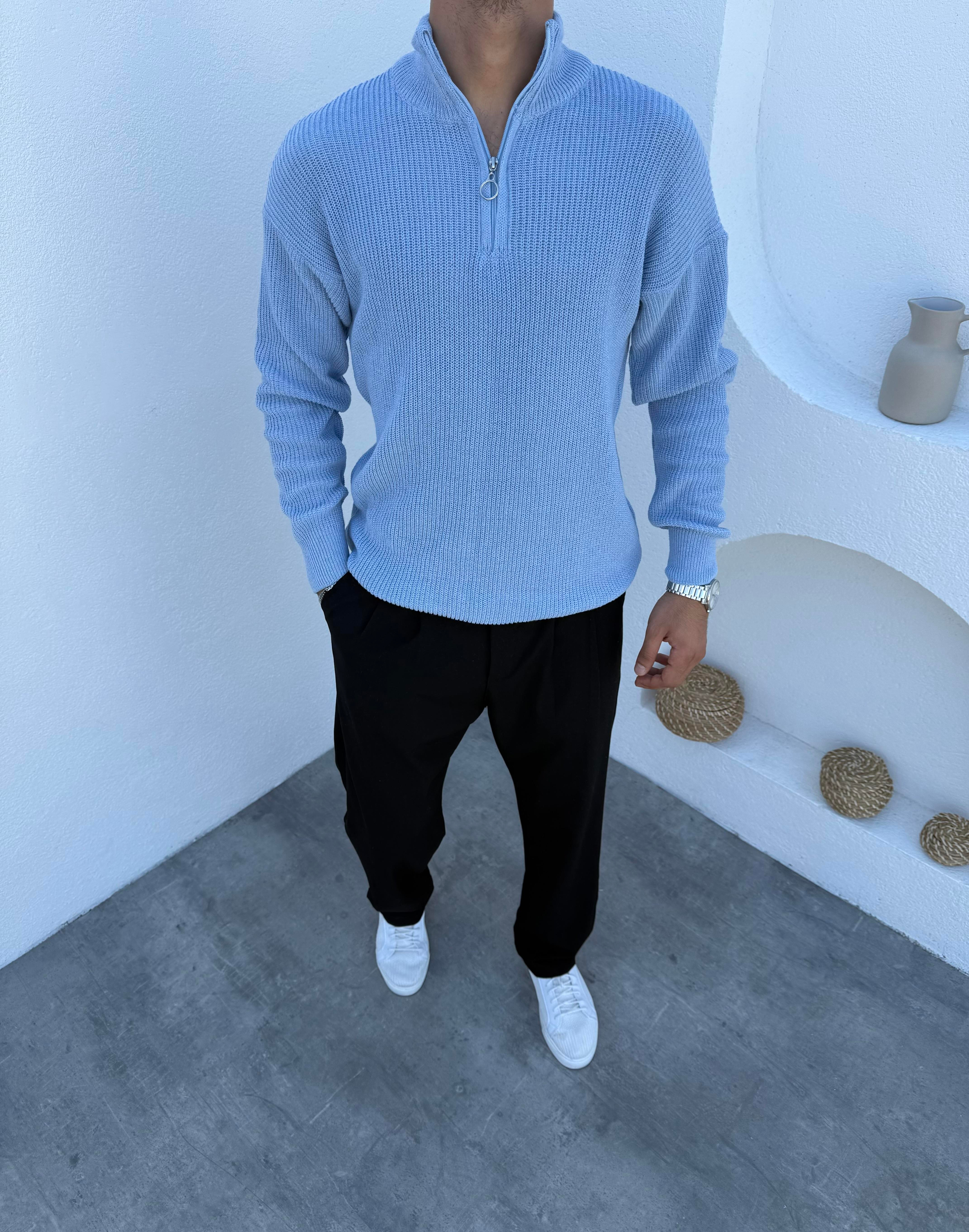 Ribanalı Dik Yaka Yarım Fermuar Triko Bebe Mavi (FM23011)