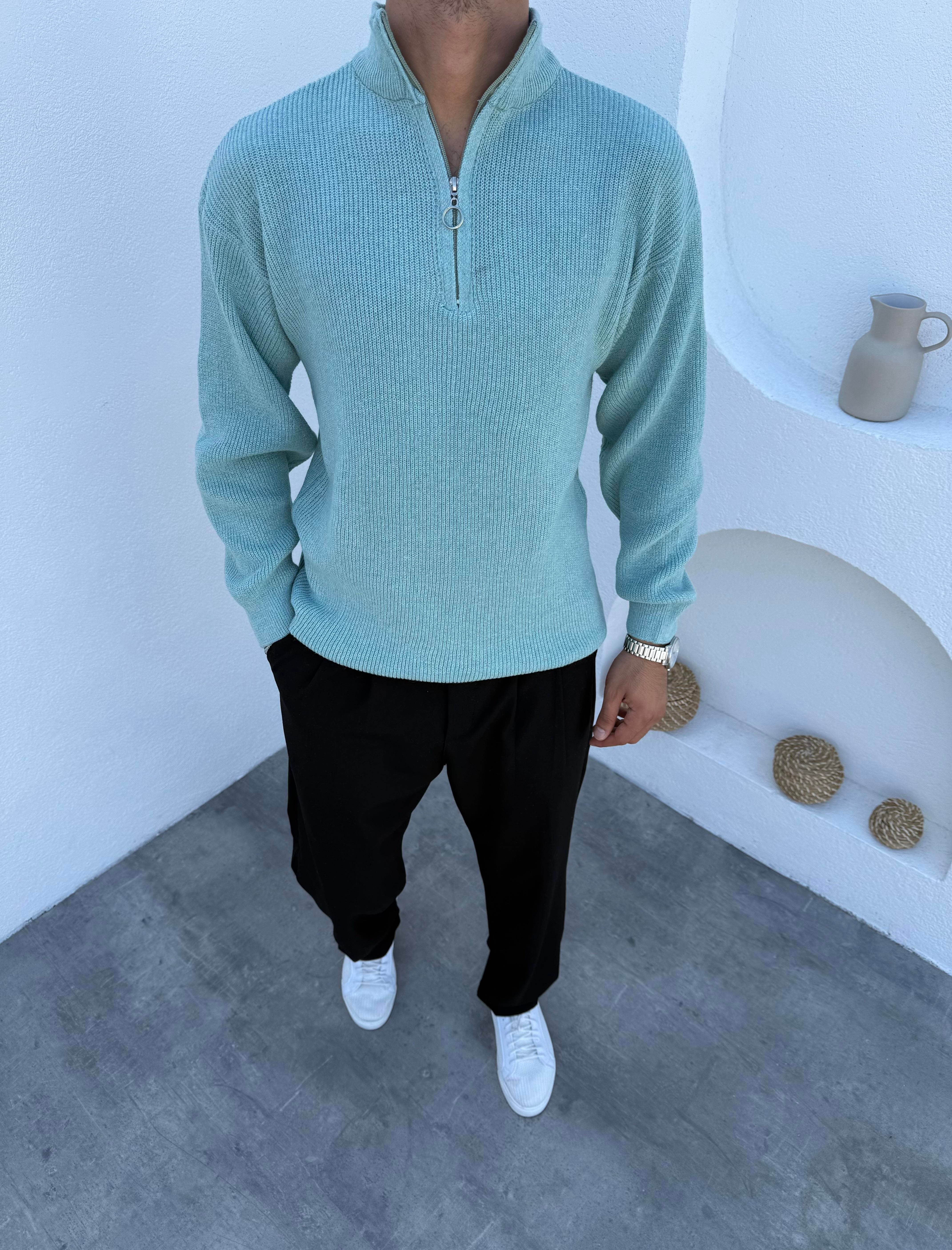 Ribanalı Dik Yaka Yarım Fermuar Triko Mint Yeşili (FM23011)