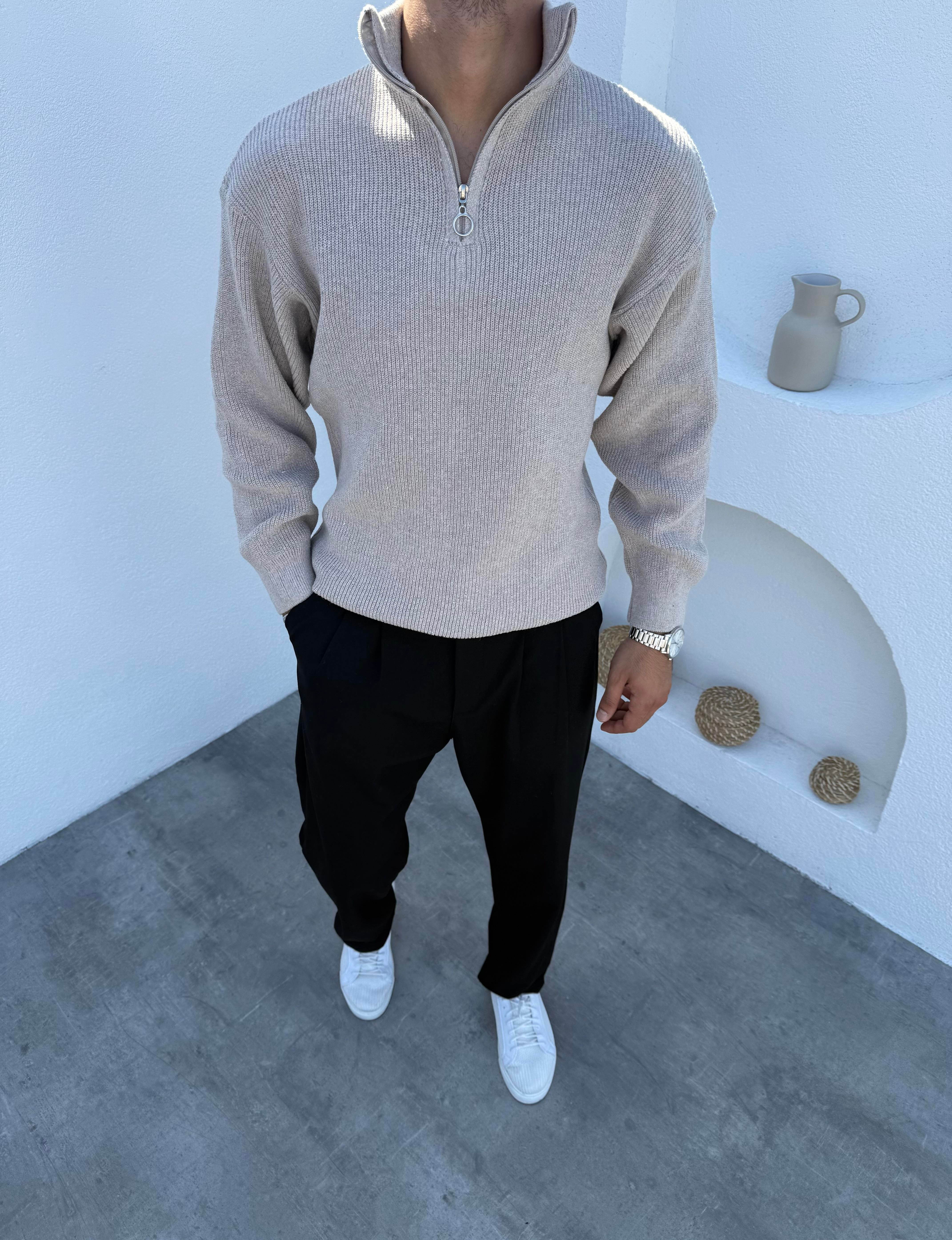 Ribanalı Dik Yaka Yarım Fermuar Triko Vizon