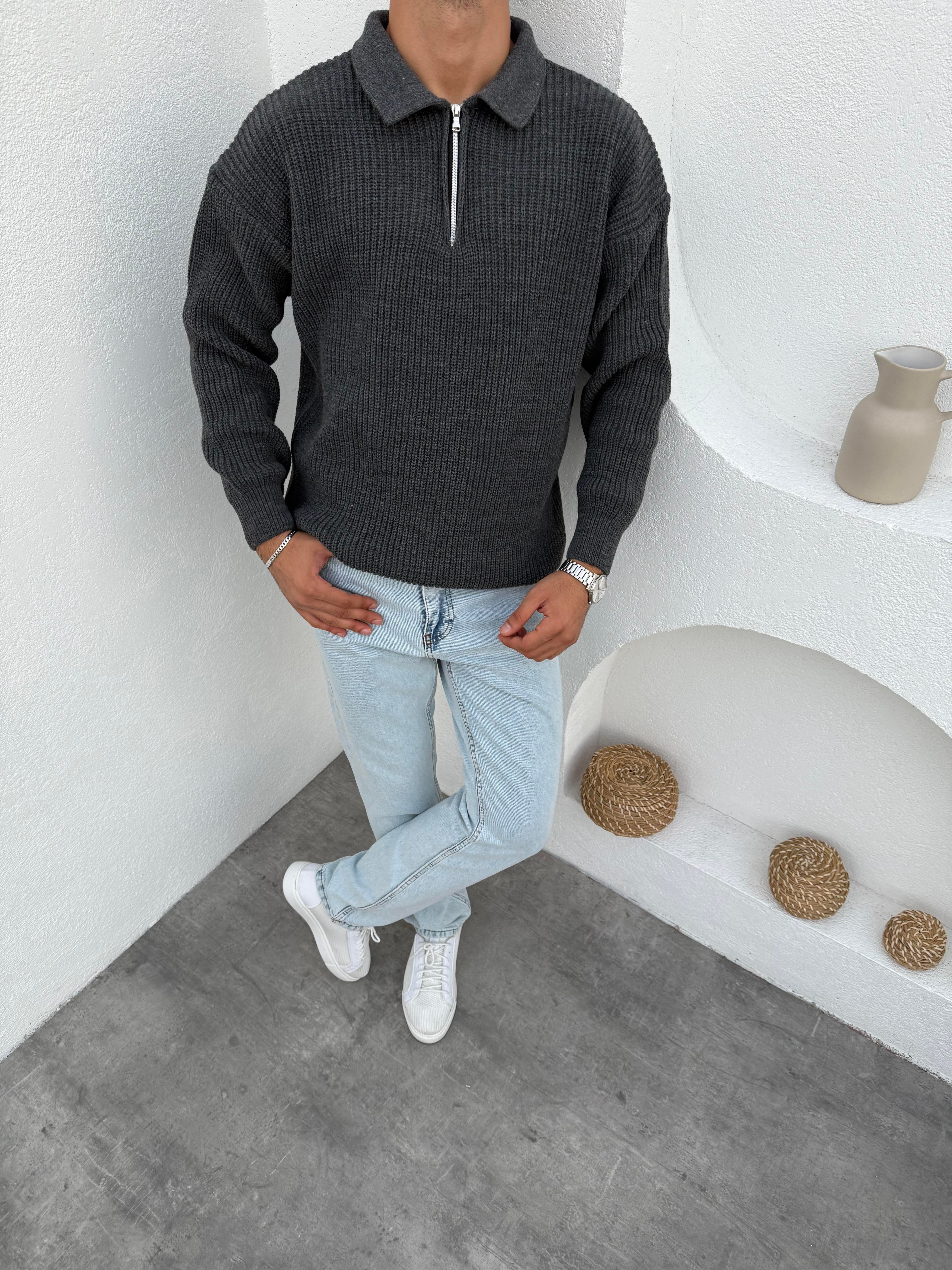 Selanik Örme Polo Yaka Triko Kazak Antrasit (FM03518)