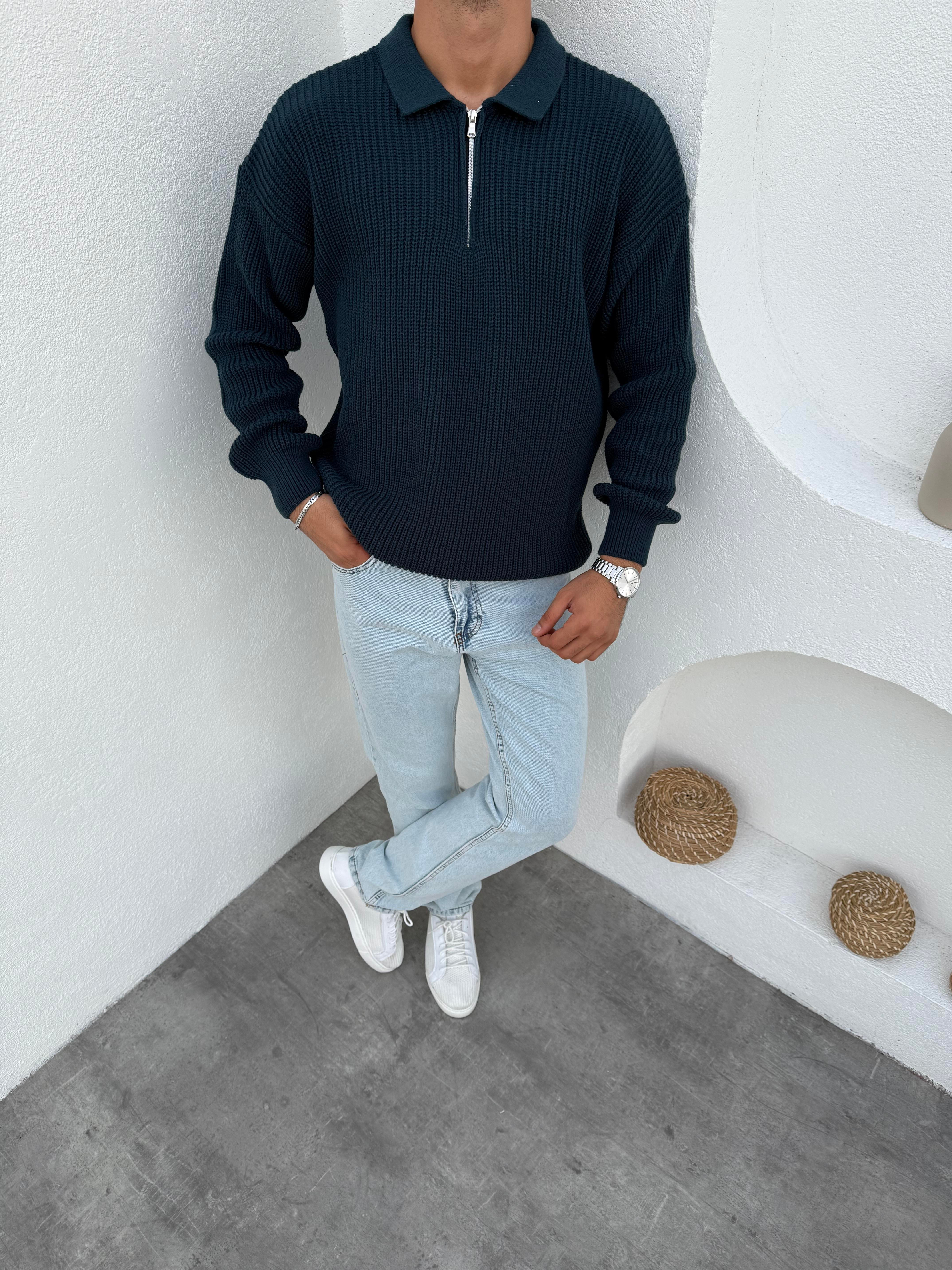 Selanik Örme Polo Yaka Triko Kazak Petrol