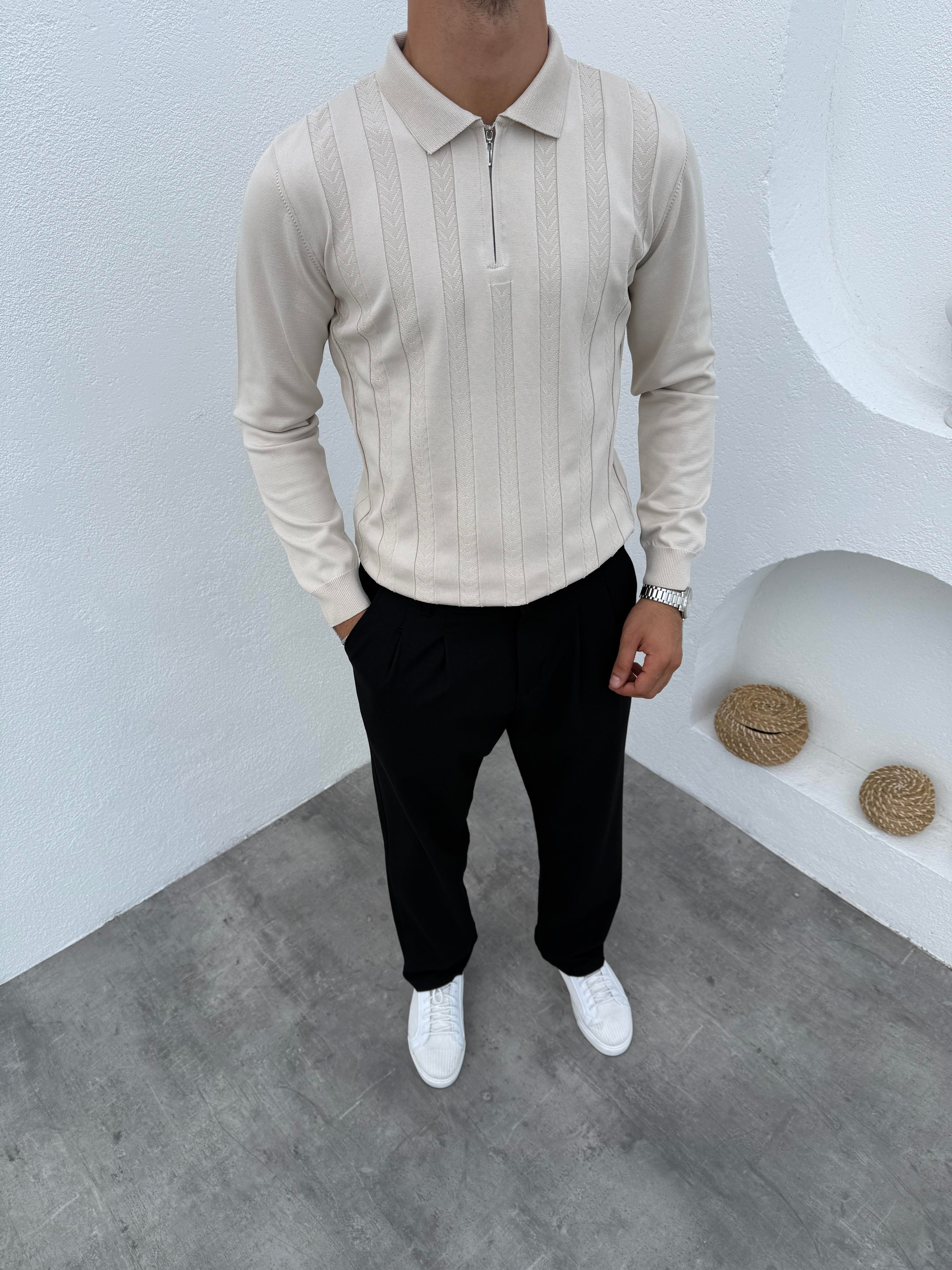 V Desen Yarım Fermuar Triko Kazak Bej (FM19357)