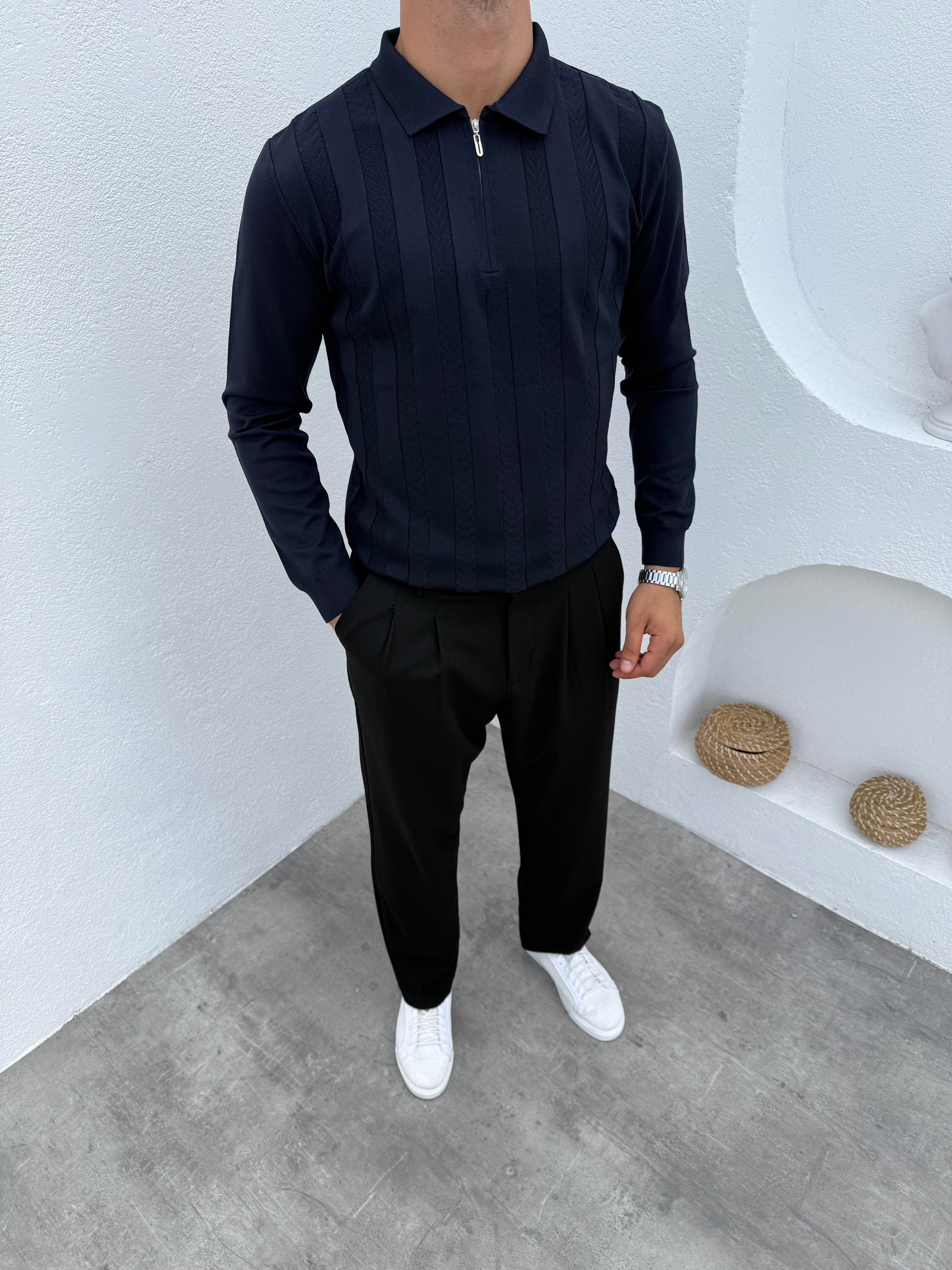 V Desen Yarım Fermuar Triko Kazak Lacivert (FM19357)