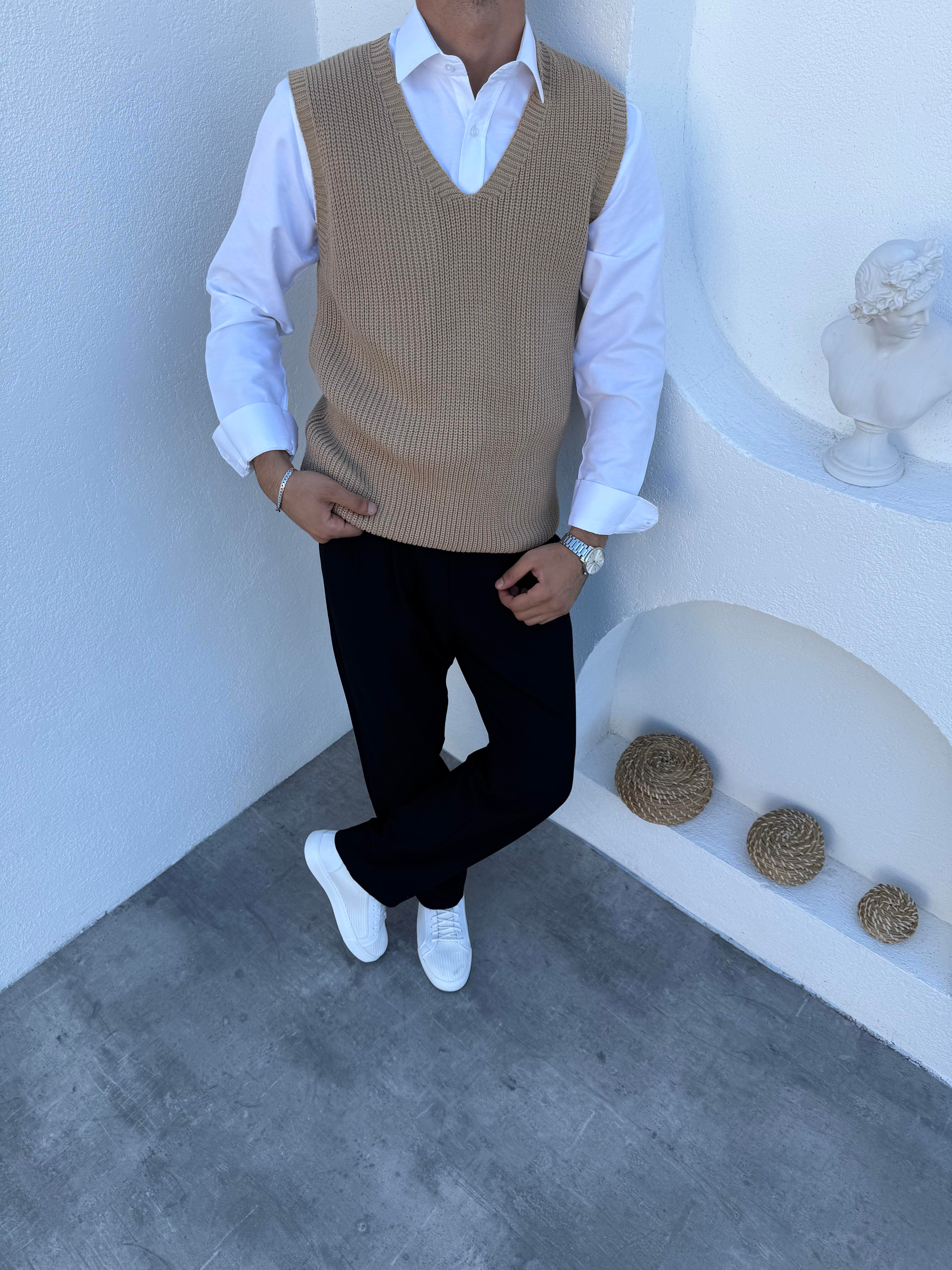 V Yaka Örme Süveter Bej (FM05193)