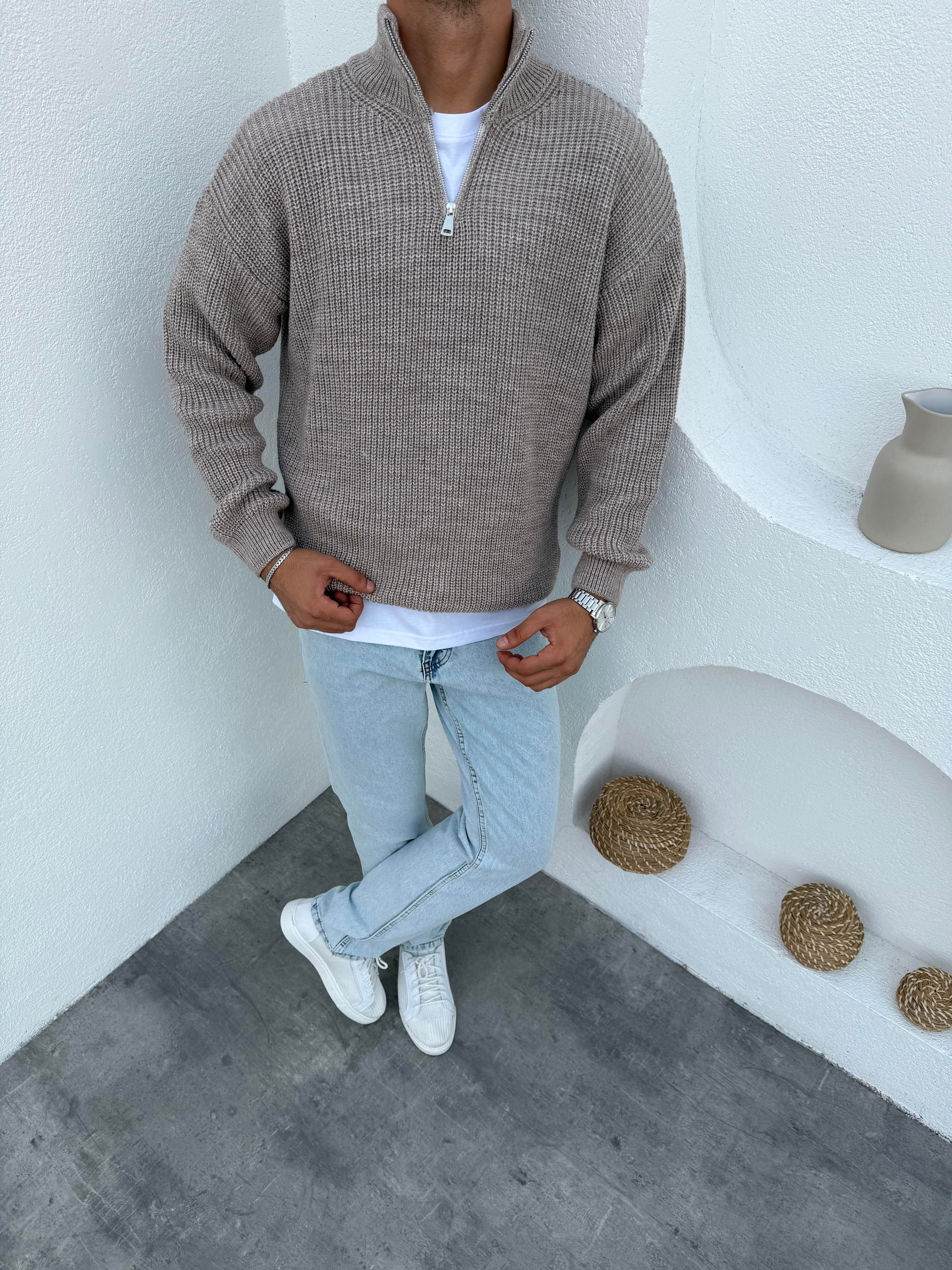 Yarım Fermuar Selanik Örgü Triko Kazak Bej (FM03153)
