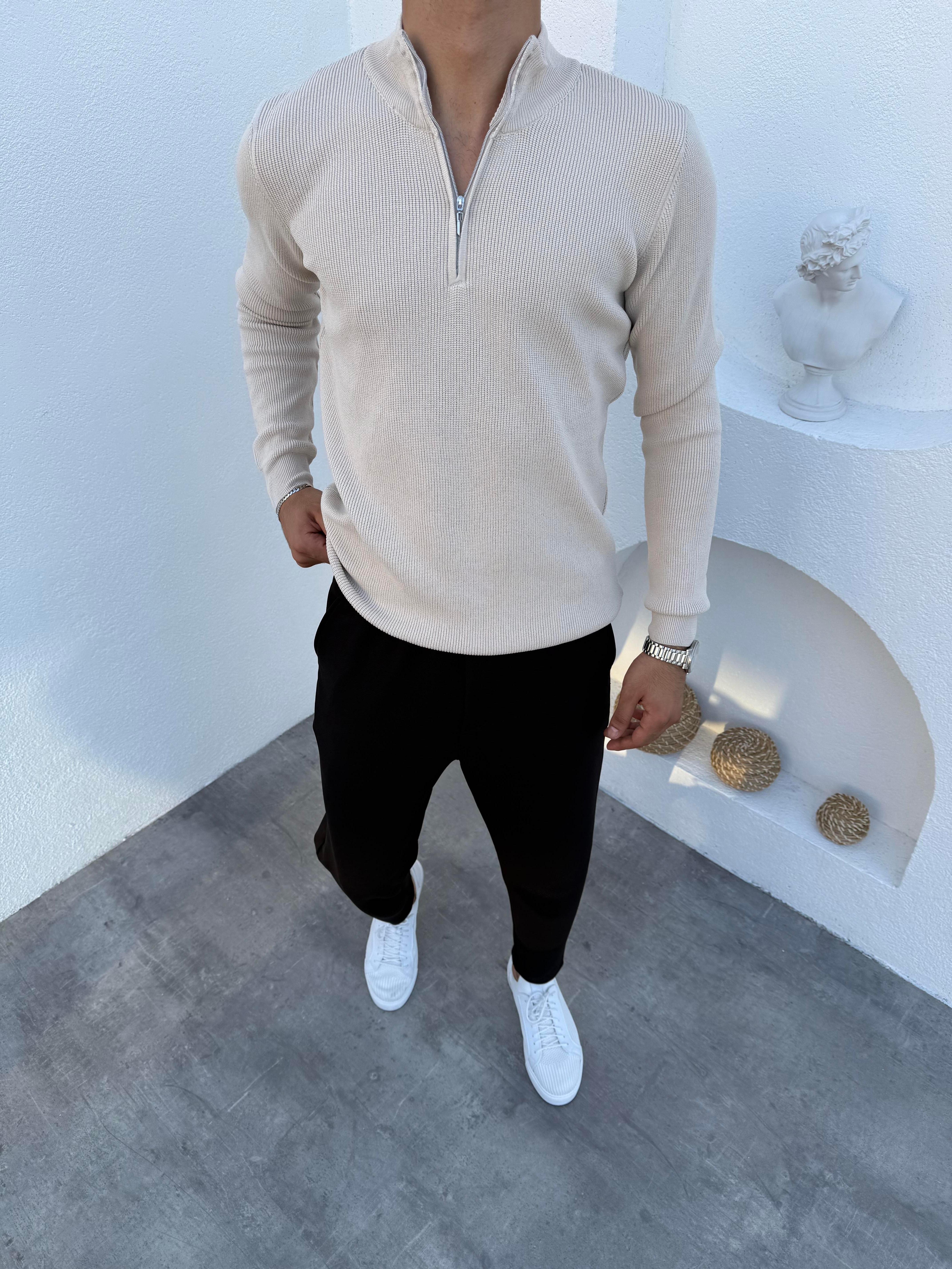 Yarım Fermuar Triko Kazak Bej (FM84622)